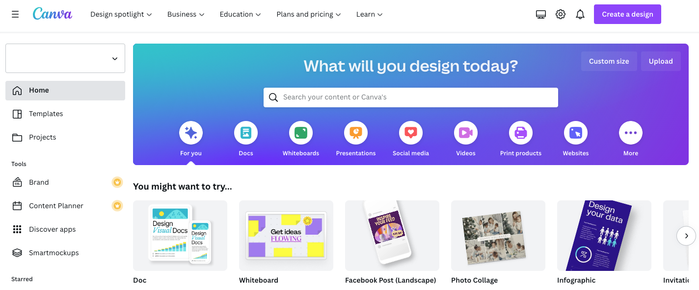 Canva bietet eine Vielzahl von kostenlosen Vorlagen, die Ihnen helfen, digitale Bilder für alle Ihre Bedürfnisse zu erstellen: soziale Netzwerke, Infografiken, Marketing-Poster, Visitenkarten, eBooks und vieles mehr. Mit seinen einfach zu bedienenden "Drag & Drop"-Funktionen bietet Canva eine große Auswahl an Optionen für die Fotobearbeitung, Farbpaletten, Schriftart-Kombinationen und vieles mehr. Eine Audiodatei, die für kleine Unternehmen interessant sein könnte, ist der Logo Creator.
