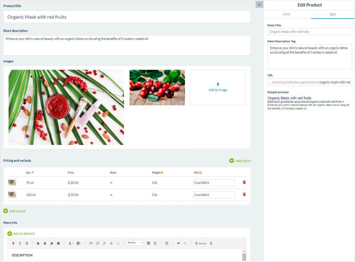 - Fügen Sie mehrere Fotos zu einem Produkt hinzu. Laut einer Studie von Shopify ziehen es 33% der Nutzer vor, mehrere Fotos zu sehen. In Ihrem GoodBarber Shop-Backoffice können Sie bis zu 9 Fotos zu Ihrem Produkt hinzufügen und diese nach der Variante, die Sie hervorheben möchten, anordnen. Stellen Sie sicher, dass Sie Ihr Produkt aus verschiedenen Blickwinkeln zeigen.