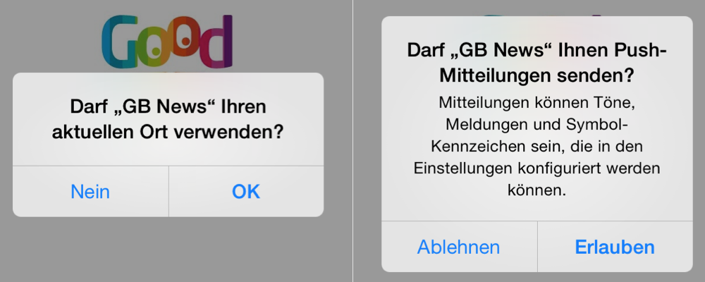 Wenn Sie also zum ersten Mal eine GoodBarber App auf iOS installieren, werden Sie gefragt, ob Sie Push-Benachrichtigungen von der App akzeptieren möchten, damit die App zu jedem Zeitpunkt Push-Nachrichten erhalten kann. Aus dem gleichen Grund wird die Berechtigung zum Zugriff auf den Standort sofort erfragt, damit gezielte Push-Nachrichten gesendet werden können.
