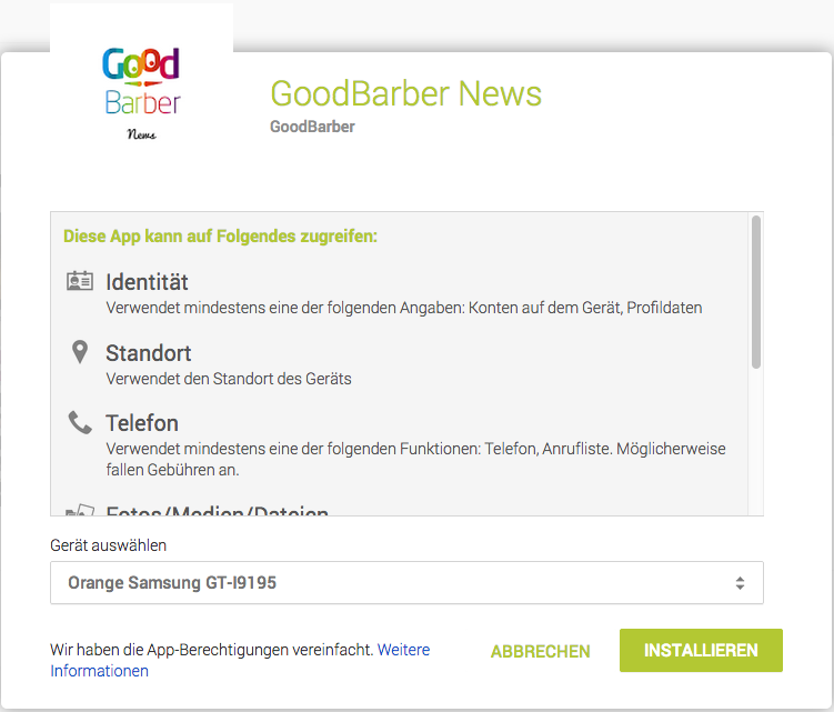 Interessanterweise sieht die Liste der Berechtigungen für ein- und dieselbe App nicht identisch aus, wenn Sie sie direkt über .apk Datei statt über den Play Store installieren, etwa wenn Sie die App vor dem Veröffentlichen testen. Diese Liste ist detaillierter als die im Play Store. Dies liegt vermutlich daran, dass Google möchte, dass Nutzer besonders vorsichtig sind wenn sie (bislang) noch nicht veröffentlichte Apps installieren, da diese Malware enthalten können (natürlich nicht wenn sie von GoodBarber kommen). In diesem Falle sieht die Liste der Berechtigungen so aus: