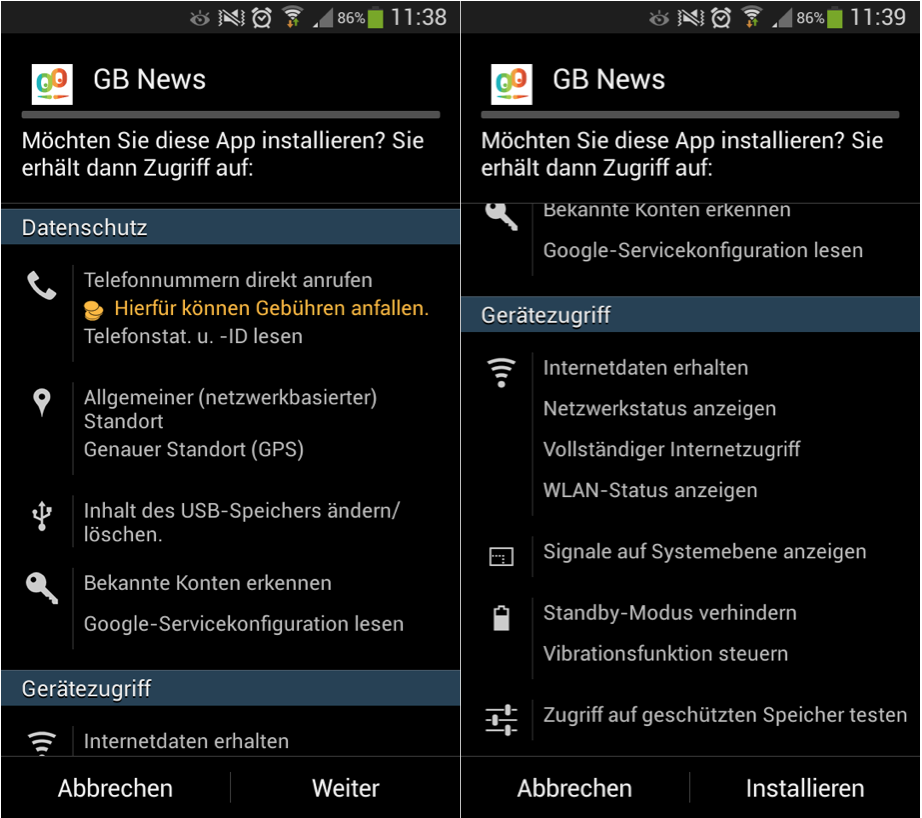 - Inhalt des USB-Speichers ändern/löschen und Zugriff auf geschützten Speicher testen: Diese hören sich besonders verdächtig an, doch sie bedeuten lediglich, dass die App Inhalte lokal speichern kann, anstelle die Inhalte bei jedem Mal vom Server herunterladen zu müssen. So wird die App schneller, und es kann auch offline auf Inhalte zugegriffen werden.