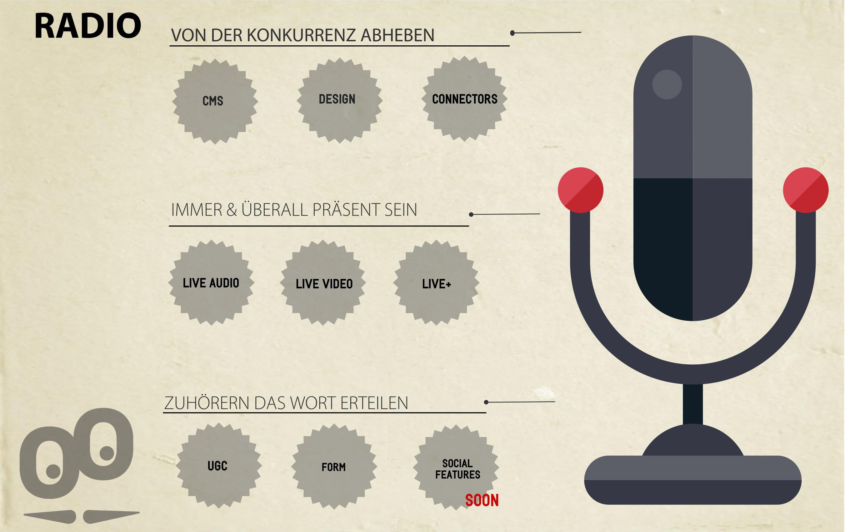 - Von der Konkurrenz abheben: Hier liegt das ganze Augenmerk auf dem Inhalt - die Merkmale, die Sie in der Radiowelt ausmachen, sollten immer offensichtlich sein. Es gibt viele Möglichkeiten diese einzigartigen Merkmale zu präsentieren: in Artikeln, Bildern, Videos und natürlich mit Hilfe des Designs und allen anderen visuellen Aspekten Ihrer App.
