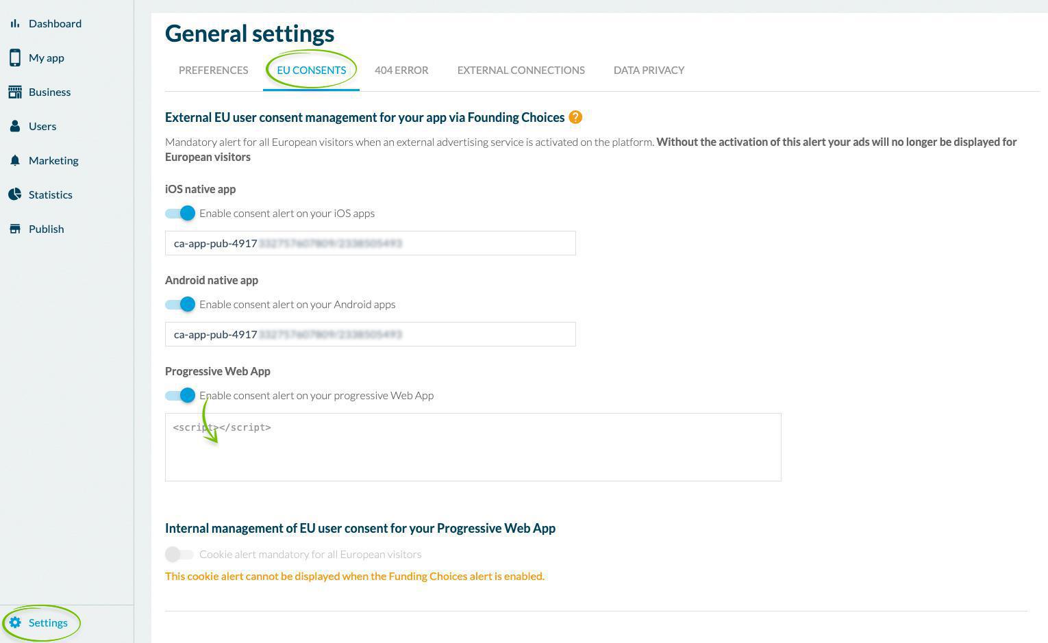 Sobald Sie dies getan haben, gehen Sie in Ihr GoodBarber-Backoffice, um den Funding Choices-Alarm für Ihre iOS- und/oder Android-App zu aktivieren und fügen Sie Ihre iOS- und/oder Android-iD-App über AdMob oder Google Ad Manager hinzu.