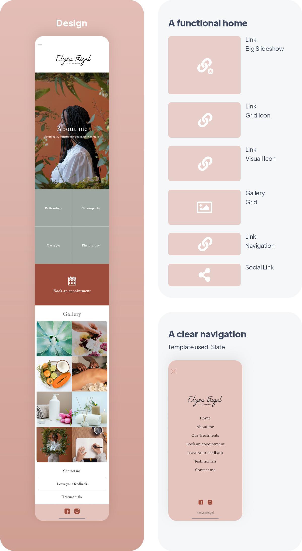 Dann gibt es ein Galerie-Widget, das den Kunden eine bessere Vorstellung von der Welt des Unternehmens vermittelt, und ein Link-Widget, das auf die Bereiche Kontakt, Einreichungen (damit Kunden einfach eine Bewertung abgeben können) und Blogs (mit einer Liste von Kundenbewertungen) verweist. Als letztes gibt es ein Widget für soziale Links mit Links zu den Facebook- und Instagram-Seiten der Heilpraktikerin.