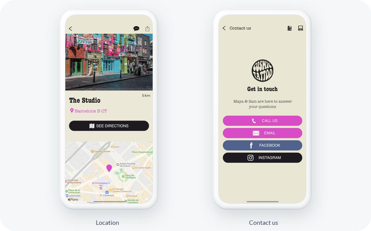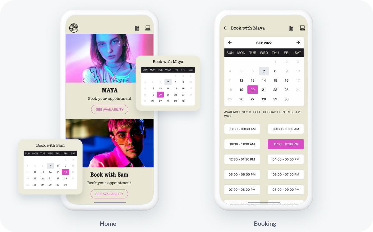 Wenn Sie mehrere Dienste in einer Struktur anbieten oder Typen von Dienstleistungen anbieten, die einen eigenen Kalender erfordern, können Sie so viele Kalender hinzufügen und verwalten, wie Sie möchten. Bei Cosmic Tattoo zum Beispiel, der App eines Tattoo Shops, gibt es einen Kalender für jeden Tätowierer. Jeder Kalender ist mit einem anderen Google-Kalender verbunden, so dass Sam und Maya ihre eigenen Kunden und Termine verwalten können. Die Kunden können wählen, mit wem sie einen Termin vereinbaren möchten, und das alles über die gleiche App.