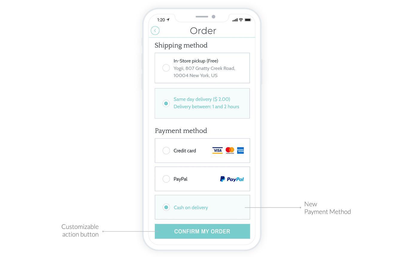 Wenn Sie digitale Geräte wie Apple Pay für iOS in Ihre E-Commerce App integrieren, kann die Zahlung mit einem einzigen Klick erfolgen. Sie können auch verschiedene Zahlungsgateways aktivieren: Stripe, PayPal, Mercado Pago oder Offline-Zahlung, um Ihren Nutzern die Möglichkeit zu geben, außerhalb der App zu bezahlen. So erreichen Sie ein breiteres Publikum.