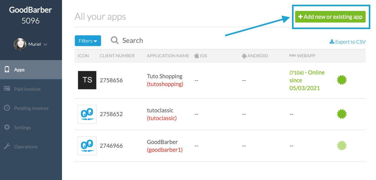 Das Estellen sie eine App ist sehr einfach. Loggen Sie sich einfach in Ihr Dashboard ein und klicken Sie auf die Schaltfläche "Estellen sie eine App oder Hinzufügen" in der oberen rechten Ecke.
