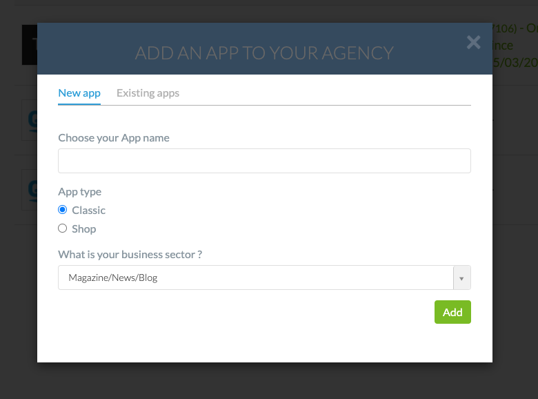 Wählen Sie dann den Namen Ihres Projekts, den Typ (Classic oder Shop), die Kategorie der App und bestätigen Sie. Denken Sie daran, dass Sie mit einem Reseller Abonnement so viele Apps erstellen können, wie Sie möchten. Ihre neue App ist damit erstellt und wird in der Liste der Apps auf Ihrem Dashboard angezeigt.