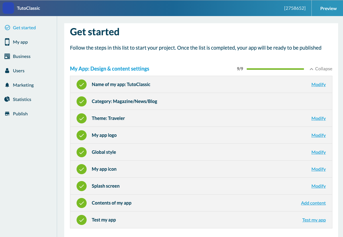 Nachdem Sie nun wissen, wie Sie eine App über Ihr Dashboard erstellen, möchten wir Ihnen zeigen, wie eine Classic App funktioniert. Wenn Sie vom Dashboard aus auf den Projektnamen klicken, gelangen Sie in das Backoffice der Anwendung, das die einzige Schnittstelle ist, auf der Sie Ihre erste App übernehmen werden. Im Backoffice sehen Sie das Menü "Get Started", über das Sie den Fortschritt der Erstellung Ihrer App verfolgen können.