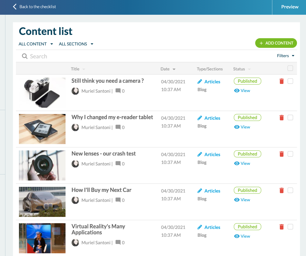 Gehen Sie zunächst zu "Meine App" > "Inhalt". Von hier aus können Sie Inhalte aller Typen hinzufügen. In der "Inhaltsliste" können Sie alle Inhalte der App anzeigen und organisieren.