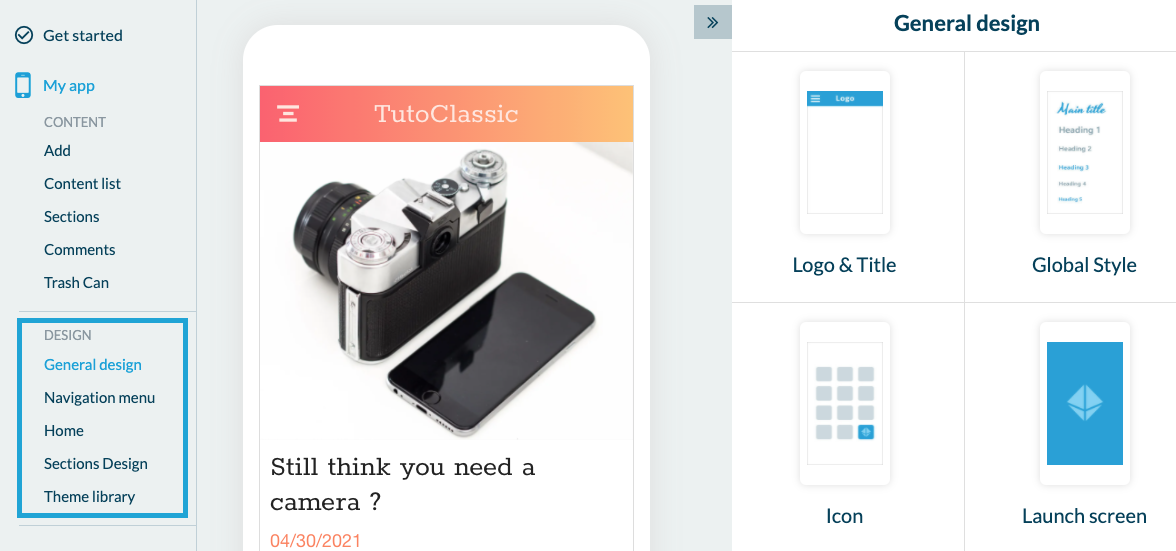 Sie können dann im Bereich "Design" mit dem allgemeinen Design fortfahren. Hier können Sie die Kopfzeile, den "Globalen Stil" mit vorinstallierten Farbenpaletten, das Symbol der App, den Startbildschirm und den Hintergrund anpassen. Im weiteren Verlauf des Designs können Sie auch das Navigationsmenü anpassen. Wir bieten Ihnen 5 Basisdesigns + die Möglichkeit, ein Design von Grund auf zu erstellen oder gar kein Menü anzuzeigen. In diesem Fall wird der Benutzer nur über den "Start" durch die App navigieren können. Apropos "Start": Das ist das weitere Menü. Auf dieser Seite werden Sie die wichtigsten Inhalte der Anwendung übernehmen. Hier geht es um das Hinzufügen von Widgets. Es gibt 7 Möglichkeiten: Inhalte aus der App übernehmen, einen externen oder internen Link hinzufügen, Werbung einfügen, Links zu sozialen Netzwerken, ein Newsletter-Abonnement, ein Link-Trennzeichen, Design-Zwecke oder HTML-Code für diejenigen, die sich auskennen....