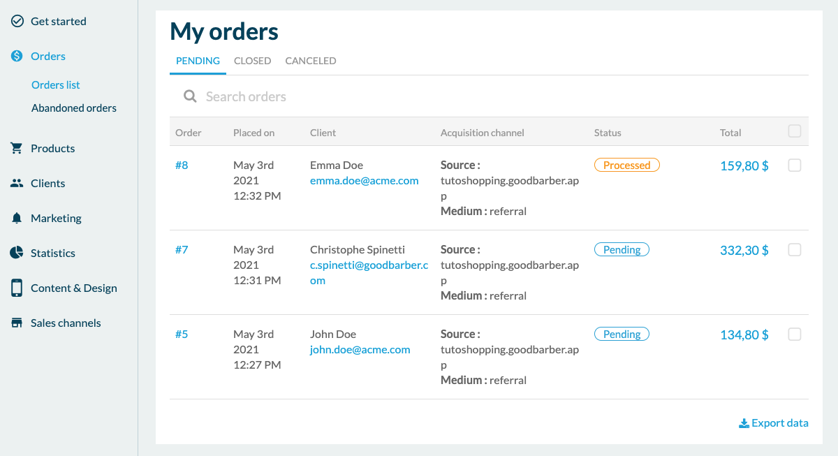 Wir beginnen mit dem Menü "Bestellungen", in dem alle Bestellungen von Endkunden verwaltet werden. Es gibt vier Zustände von Bestellungen. "Ausstehend" und "Bearbeitet" werden in der Registerkarte "Offen" aufgelistet. Mit dem Status "Geliefert" wird die Bestellung auf die Registerkarte "Geschlossen" umgeschaltet. Sobald eine Bestellung auf "geschlossen" gesetzt wurde, wird sie in den Statistiken erfasst. Der Status "Abgebrochen" schließlich listet die abgebrochenen Bestellungen auf. Wenn Sie in die Details einer Bestellung gehen, sehen Sie alle Informationen, die für die Bearbeitung der Bestellung relevant sind, wie z.B. die bestellten Artikel, den Typ der Zahlung, den Standort des Kunden oder den Kaufkanal.