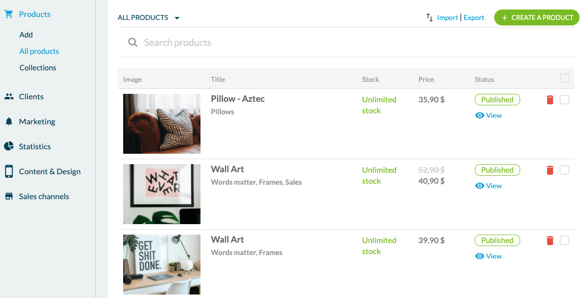 Unter "Produkte" können Sie natürlich auch ein Produkt hinzufügen. Hier können Sie den Titel und Untertitel des Produkts konfigurieren, bis zu 9 Fotos, Text und Varianten hinzufügen. Sie können auch einen durchgestrichenen Preis, den Lagerbestand und eine Referenz hinzufügen. Varianten sind nützlich, um verschiedene Größen, Farben oder Verpackungen aufzulisten. Wenn Sie z.B. eine App für den Verkauf von T-Shirts erstellen, können Sie alle Größen und Farben des T-Shirts auflisten. Es ist nicht nötig, ein Produkt pro Farbe zu erstellen. Sobald das Produkt erstellt ist, finden Sie es unter "Alle Produkte". Hier sehen Sie alle Ihre Produkte und können sie in verschiedenen Sammlungen ablegen. Apropos Sammlungen: Im Weiteren Menü können Sie Sammlungen erstellen und konfigurieren. Sammlungen sind Produktgruppen, mit denen Sie das Navigationsmenü und die Start-Seite organisieren können.
