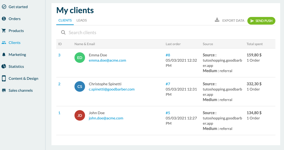 Wenn Sie im Menü fortfahren, sehen Sie die Optionen für die Verwaltung von Kunden. Hier finden Sie zunächst die Liste der Kunden der App. Dies sind Personen, die sich registriert und mindestens eine Bestellung in der App aufgegeben haben. Die Kundenkartei enthält alle relevanten Informationen wie Kontaktinformationen, den Verlauf der Bestellungen oder den ausgegebenen Gesamtbetrag. Die Registerkarte "Interessenten" listet die Personen auf, die sich bei der App registriert haben, aber noch nie etwas gekauft haben.