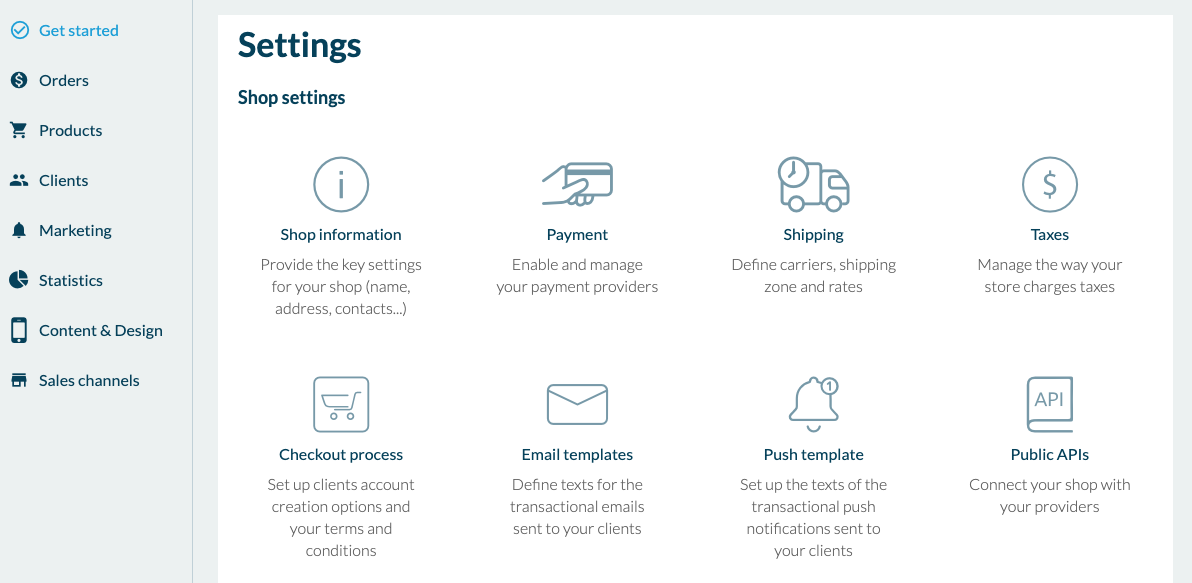 Um eine Shop-App zu Estellen sie eine App, müssen Sie den gleichen Prozess wie bei der Classic-App über das Dashboard durchlaufen, aber natürlich "Shop" wählen. Das Menü "Get started" funktioniert wie bei der Classic.
