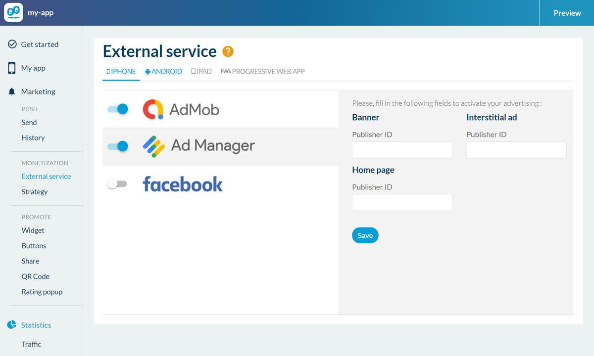Sie können einen externen Anbieter nutzen. Dies ist die einfachste Form, um Werbung in Ihrer App zu schalten. Wählen Sie einfach den externen Anbieter aus, mit dem Sie zusammenarbeiten, geben Sie Ihre Login-Daten in Ihr Backoffice ein und GoodBarber wird die Werbung automatisch abrufen und in Ihrer App anzeigen. Es gibt nichts weiter zu tun. Einfach nur warten und Geld verdienen.