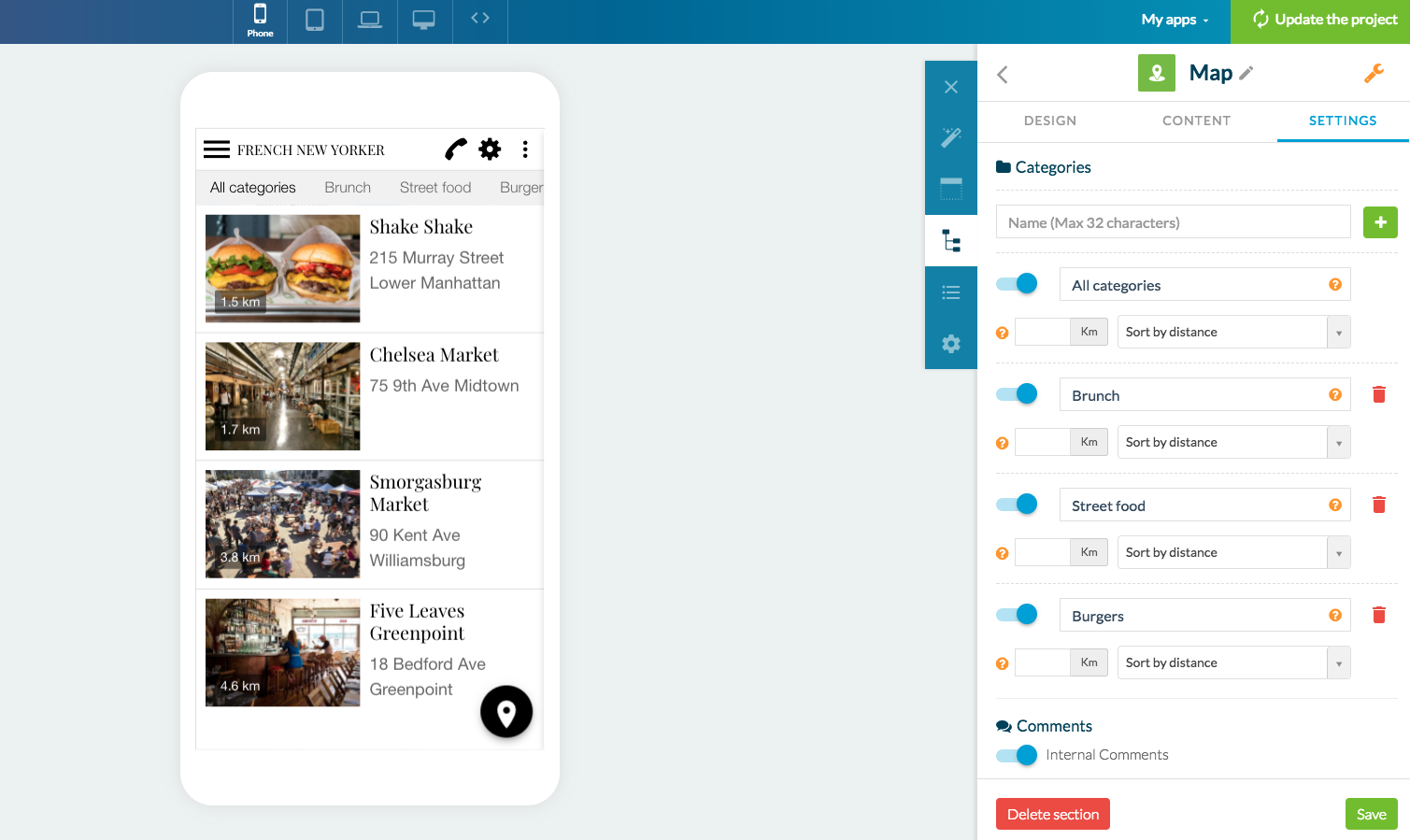 Ich empfehle Ihnen, den Bereich voll auszunutzen, indem Sie weitere Funktionen zu Ihrer Map hinzufügen, wie z.B. die Suchmaschine, das Kommentieren von Disqus oder das Organisieren von Inhalten nach Kategorien. Für letztere können Sie in der Registerkarte "Settings" des Bereichs Map Ihre Kategorien erstellen. Ich selbst habe vor allem versucht, meine bevorzugten Standorte für Lebensmittel in New York City zu kategorisieren!