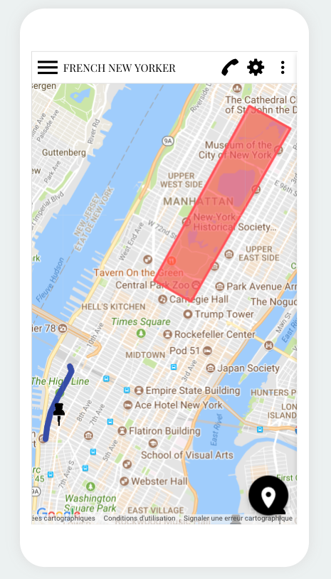 Ich selbst wollte ein rotes Polygon für den Central Park erstellen und die Strecke meines Lieblingsspaziergangs in Manhattan, die High Line, blau zeichnen.
