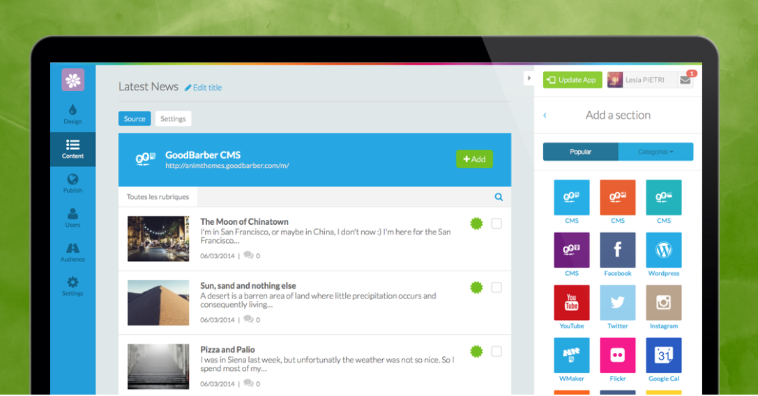 Bei GoodBarber entwickeln wir schon seit 2009 mobile Apps. Dank der Erfahrung die wir dank unserer Kundschaft sammeln konnten wissen wir, das viele unserer Kunden sich deshalb für unsere Plattform entschieden haben, da sie mit GoodBarber mithilfe einer klaren Benutzeroberfläche ihren eigenen Inhalt erstellen und verwalten können um ihrer App leben zu geben.