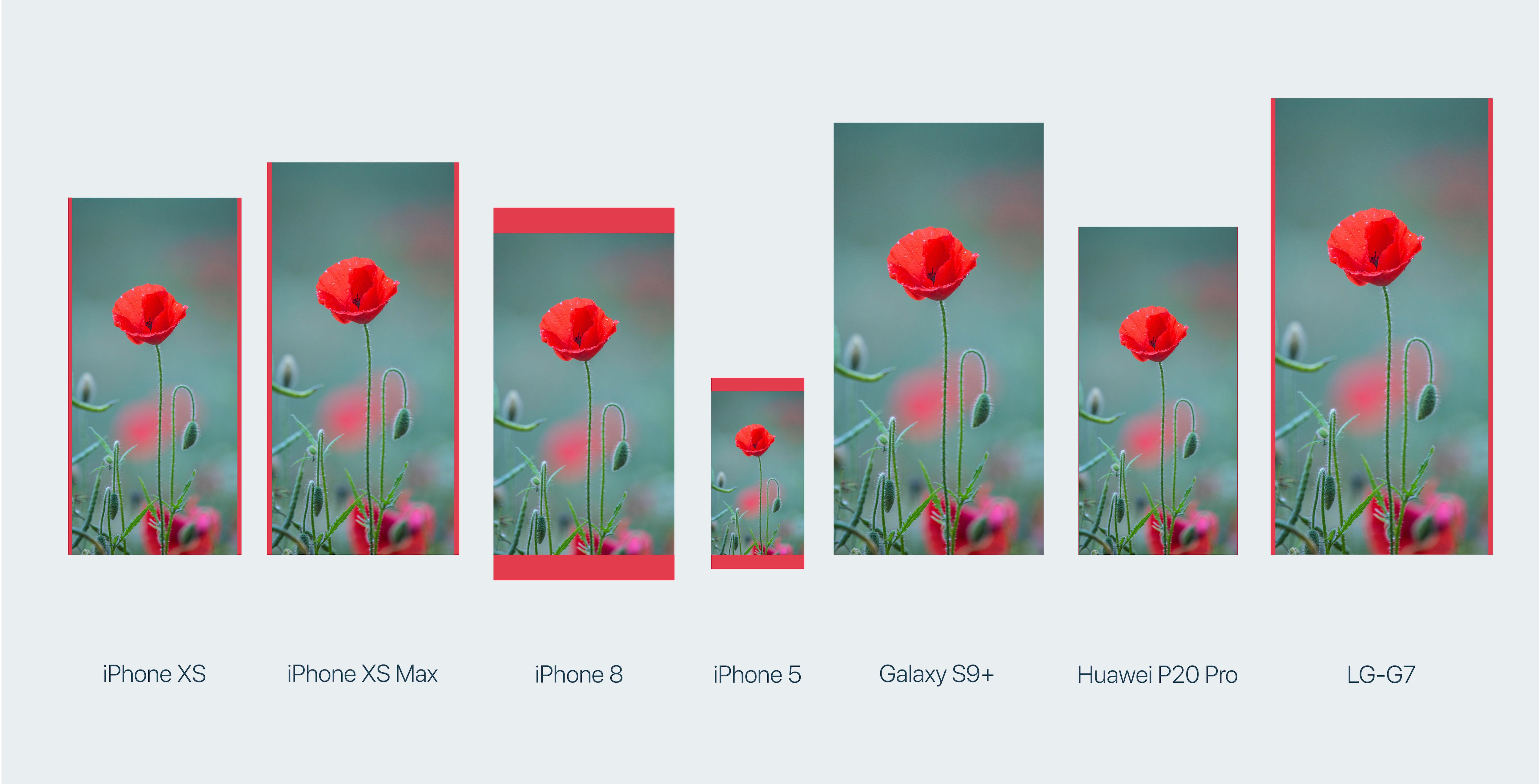 Das folgende Diagramm zeigt die Verwendung desselben Fotos in den verschiedenen Mock-Ups. Die roten Streifen zeigen Ihnen, an welchen Stellen das Bild abgeschnitten wurde.