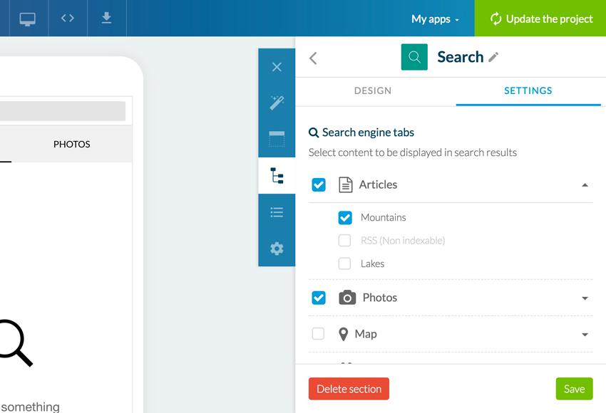 Für jede Kategorie können Sie sogar die Bereiche auswählen, für die das Suchen aktiviert ist. Im folgenden Beispiel habe ich beschlossen, die Suche in allen Bereichen der Fotos in meiner App zu aktivieren, aber bei den Artikeln nur im Bereich "Mountain". Beachten Sie, dass wenn es technisch nicht möglich ist, in einem Bereich zu suchen, dieser Bereich nicht im Panel ausgewählt werden kann. Dies ist in meinem Beispiel für den Bereich RSS der Fall.