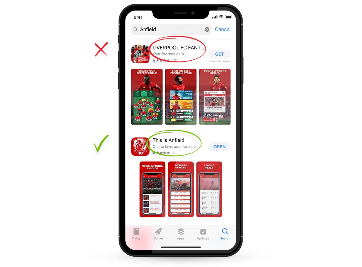 Bei Apple darf der Name und der Untertitel der App maximal 30 Zeichen enthalten. Wenn Sie jedoch z.B. mit einem iPhone X in den Store gehen und nach einem Schlüsselwort suchen, sehen Sie nur die ersten 19 Zeichen des Titels und die ersten 25 Zeichen des Untertitels auf der Seitentitelseite. Sie müssen auf die Seite der App gehen, um die berühmten 30 Zeichen zu sehen. Um eine größere Wirkung zu erzielen, sollten Sie auf den Seiten des Suchens auf iPhones keinen abgeschnittenen Text sehen.