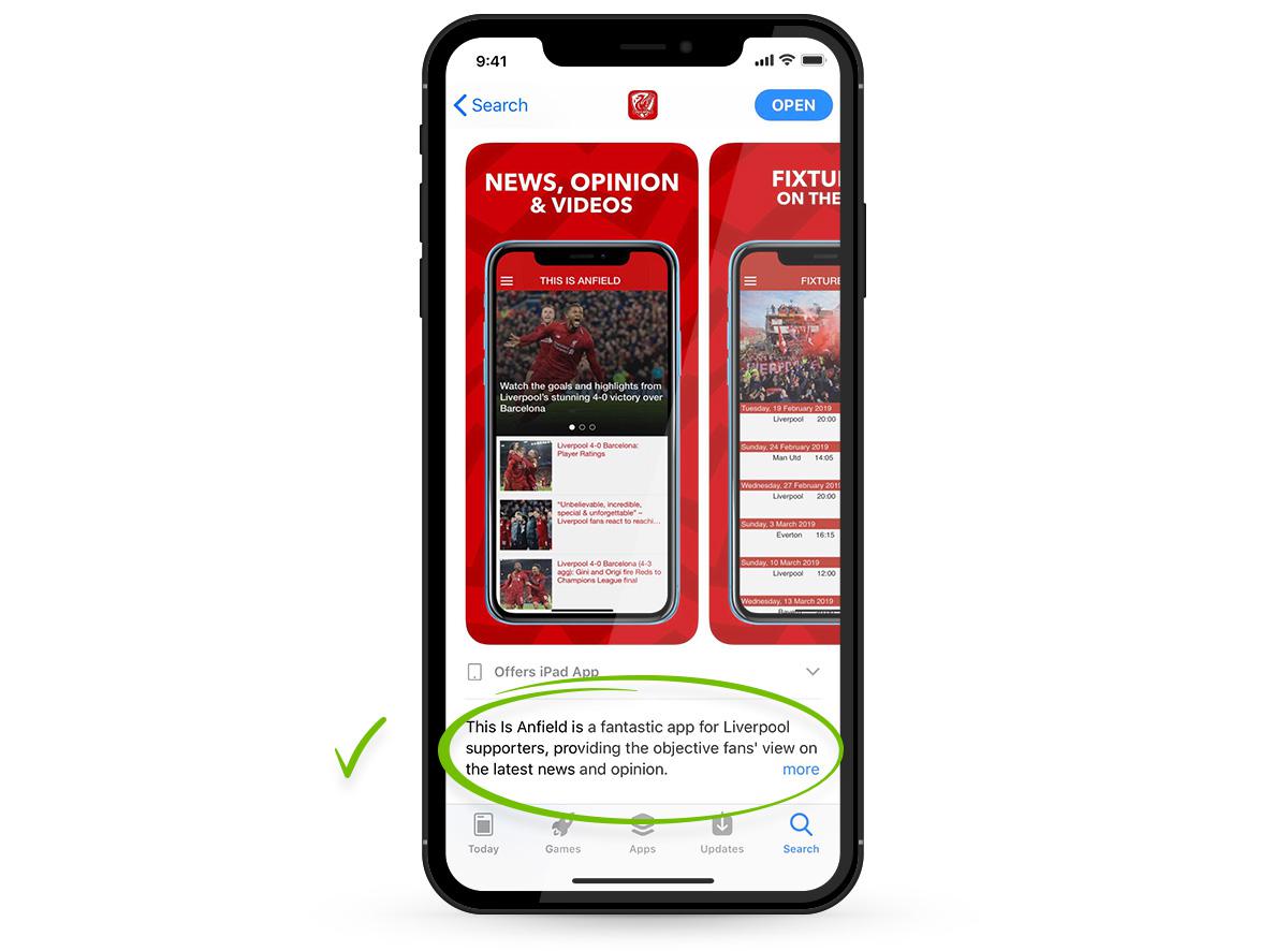 Erstens trägt die Beschreibung Ihrer App dazu bei, dass Ihre App in den Stores besser gelistet wird, was als App StoreOptimization (ASO) bezeichnet wird.