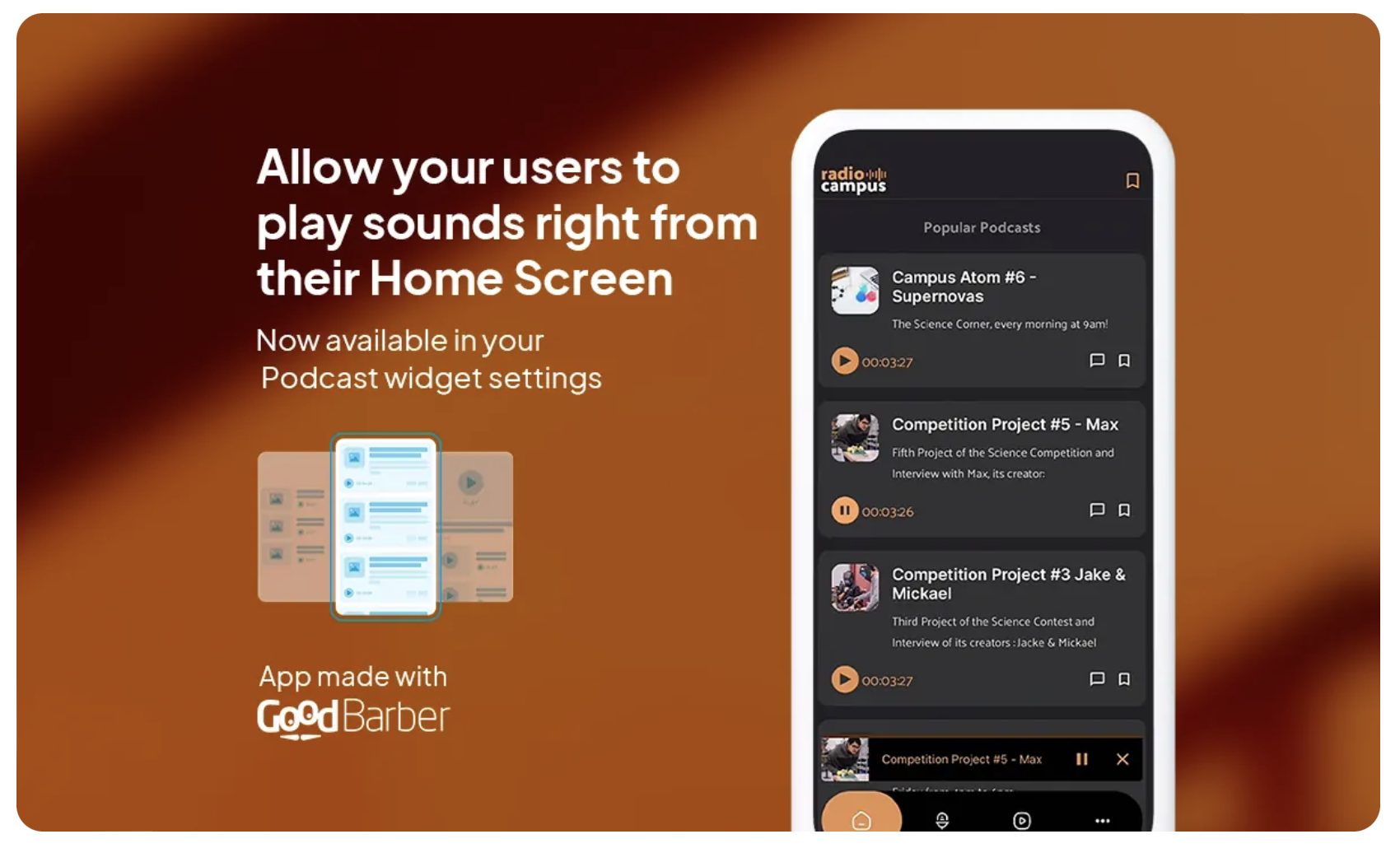 Das neue Sound-Widget bei GoodBarber wurde entwickelt, um den Zugriff auf Ihre Audioinhalte zu vereinfachen und gleichzeitig die Benutzererfahrung zu bereichern. Durch die Integration einer Wiedergabetaste direkt in jede Zelle können die Nutzer ihre Audios starten und steuern, ohne aus der Seite heraus zu navigieren, und so ein nahtloses und kontinuierliches Erlebnis gewährleisten. Dadurch wird auch der Mini-Player aktiviert, der ausfährt, ohne die Navigation des Nutzers zu unterbrechen, und so einen sanften Übergang zwischen verschiedenen Aktionen gewährleistet.