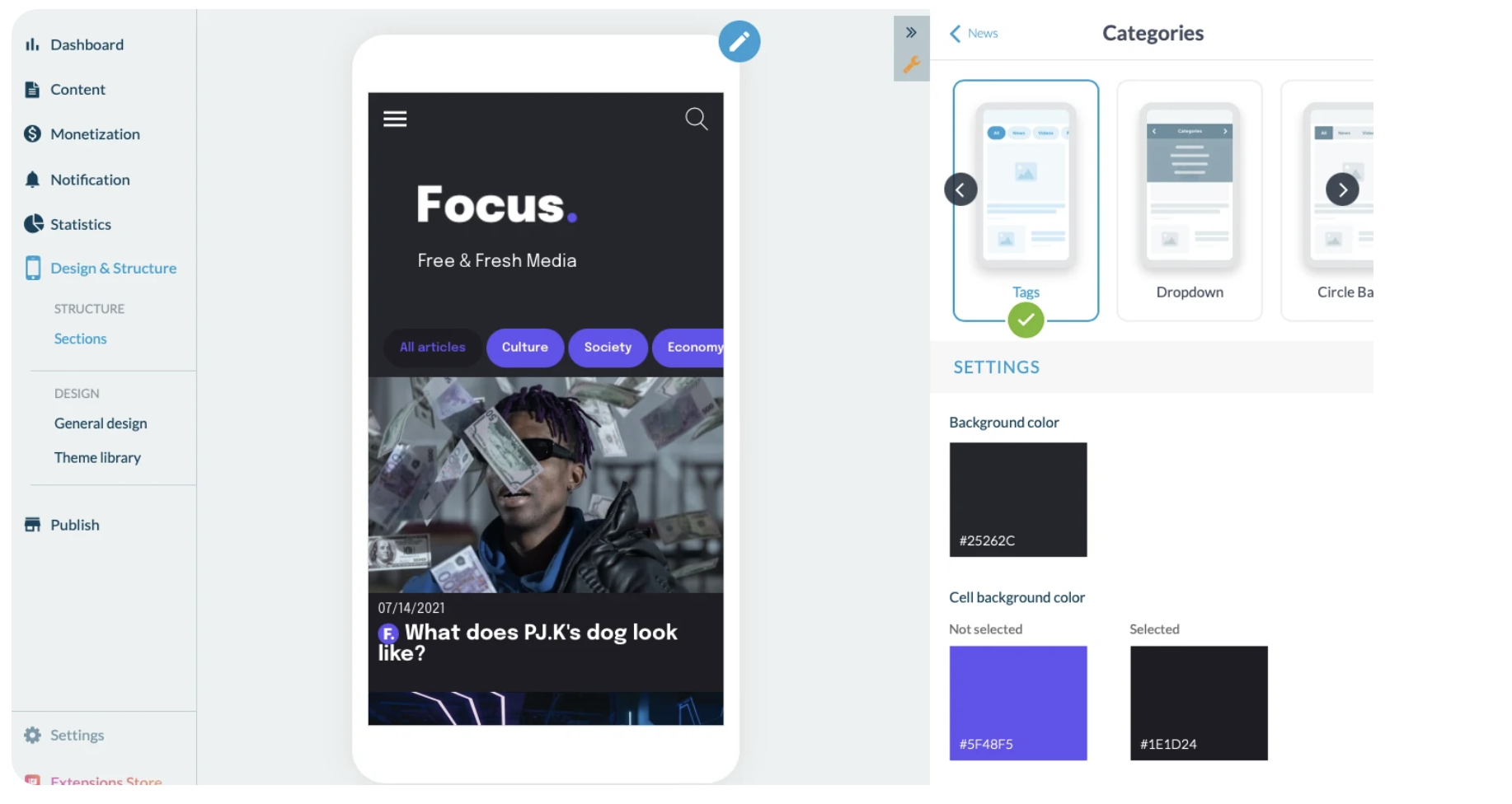 Gehen Sie in Ihrem Backoffice zu einem Bereichskategorien enthaltenden Inhalt. Im Beispiel unten bietet unser Bereich Nachrichten mehrere Kategorien: Kultur, Wirtschaft, Technologie, usw.... Klicken Sie in diesem Bereichskategorien-Panel auf Kategorien > wählen Sie die Vorlage Tags .