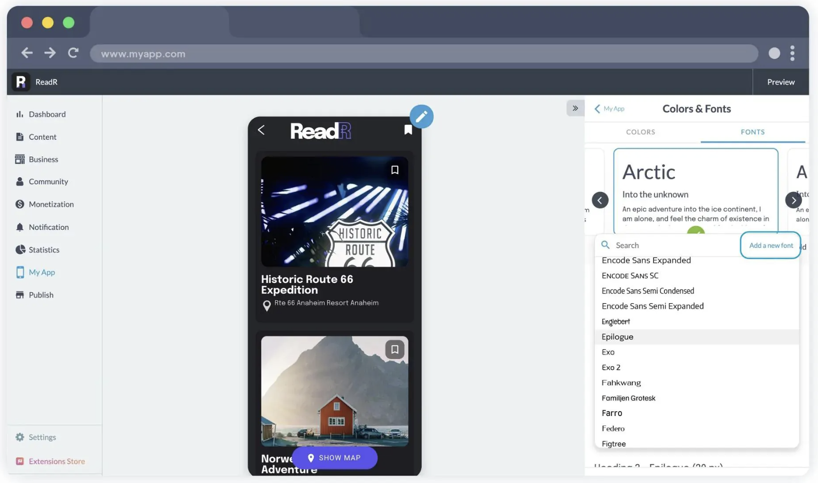Sie können Ihre Schriftarten in den gewünschten Formaten importieren (.woff2 für progressive Webanwendungen, .ttf oder .otf für native Anwendungen). Sie können bis zu zehn benutzerdefinierte Schriftarten einbinden. Sobald sie hinzugefügt wurden, sind diese Schriftarten in allen Schriftartenselektoren Ihrer Administrationsoberfläche verfügbar.