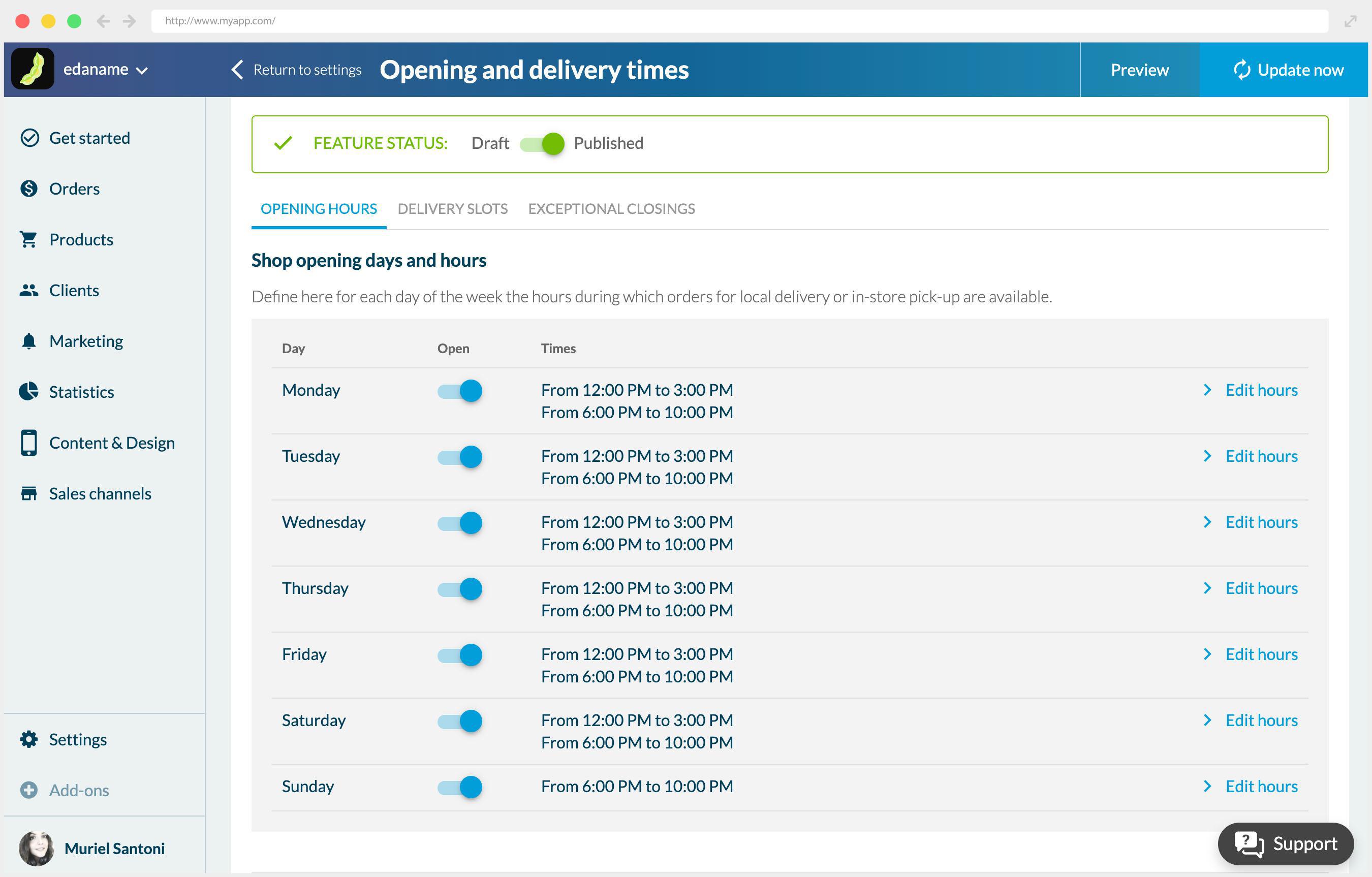 Um ihre Kunden nicht zu frustrieren und nicht unter dem Druck zu vieler Bestellungen gleichzeitig zu stehen, haben die Eigentümer von Edamame beschlossen, die Funktion Zeitfenster für die Lieferung zu aktivieren. Damit können sie Zeitfenster festlegen, in denen die Kunden die Zeitauswahl treffen können, wann sie ihre Bestellungen abholen möchten.
