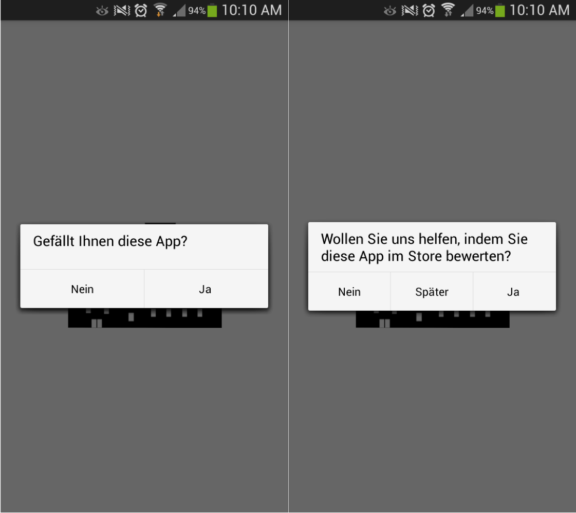 Wenn der Nutzer zufrieden ist mit Ihrer App, wird ein zweites Popup angezeigt, der den Nutzer auffordert, Ihre App in den Stores zu bewerten. Der Nutzer kann dann zwischen drei verschiedenen Antworten wählen: Ja, nein und später.