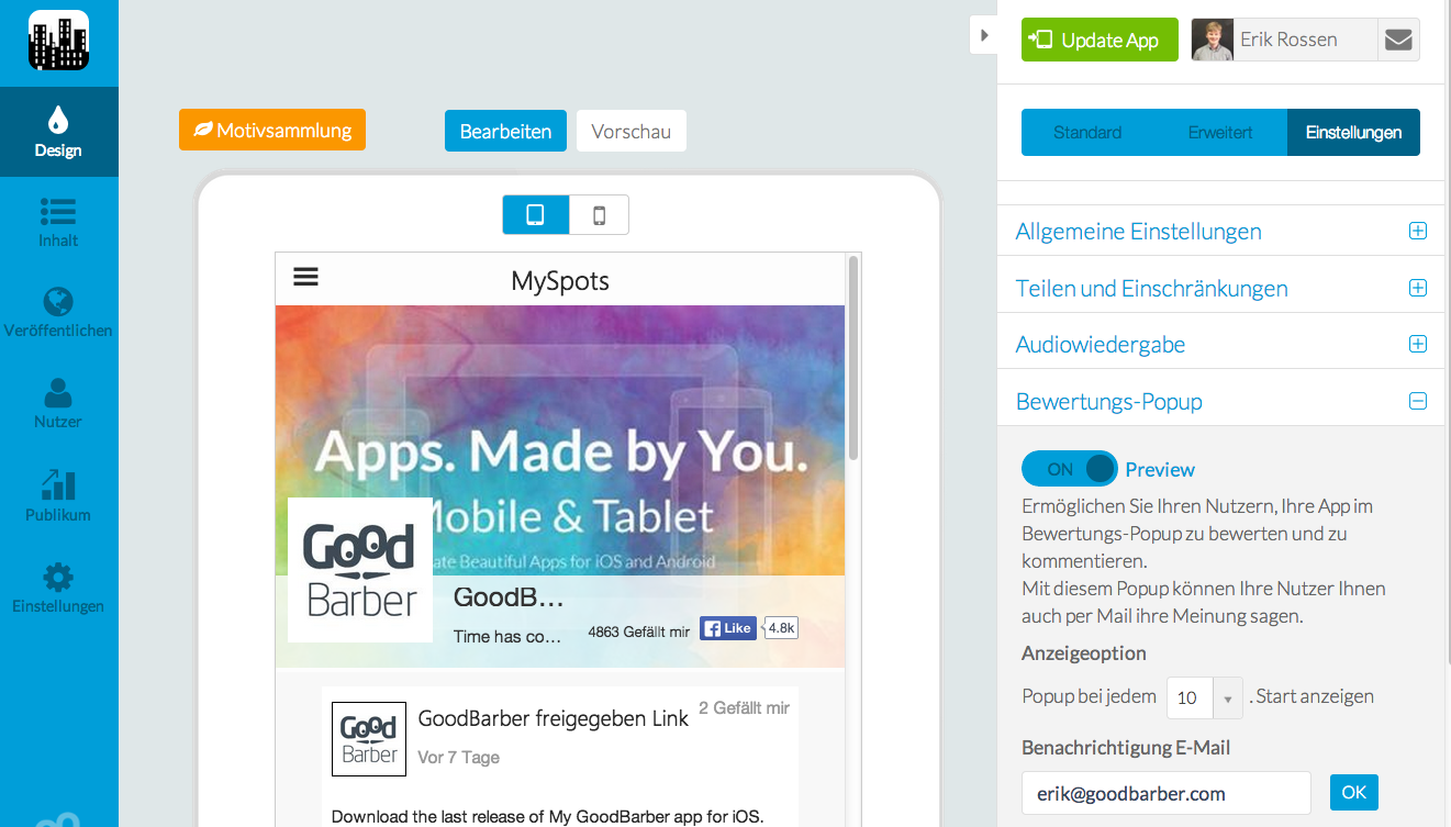 Letzte Woche haben wir Ihnen den neuen "Kontakt" Bereich vorgestellt. Heute sind wir stolz, Ihnen unsere neuen integrierten Popup vorzustellen, der Ihre Nutzer dazu auffordert, Ihre App zu bewerten.