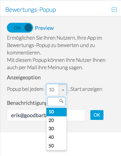 - Wählen, wann das Popup erscheinen soll. Dies geschieht nach einer bestimmten Anzahl von Aufrufen der App. (10/20/30/40/50).