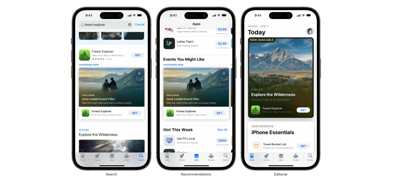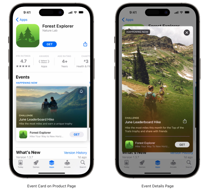 Ab iOS 15 und iPadOS 15 erscheinen Ihre eingebetteten Ereignisse direkt im App Store als ansprechende Karten mit Bildern oder Videos, einem Namen und einer kurzen Beschreibung. Wenn die Nutzer auf eine Kachel klicken, gelangen sie auf eine spezielle Seite, die ein immersives Erlebnis mit zusätzlichen Details und der Möglichkeit bietet, das Ereignis über Nachrichten oder soziale Netzwerke zu teilen. Außerdem können sie Benachrichtigungen erhalten, wenn das Ereignis beginnt. Wenn Ihre App nicht installiert ist, können die Nutzer sie direkt von der Miniaturansicht oder der Seite des Ereignisses herunterladen und werden an die entsprechende Stelle in der App weitergeleitet. Diese Ereignisse erscheinen auf Ihrer Produktseite, in den Suchergebnissen und in den personalisierten oder redaktionellen Empfehlungen auf den Tabs Heute, und Apps, wodurch ihre Sichtbarkeit und Wirkung maximiert wird.