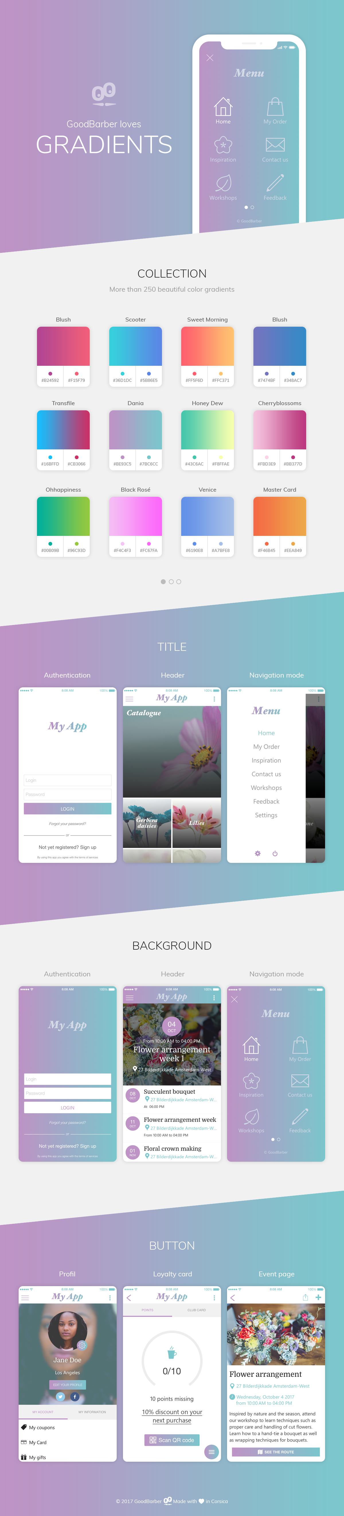 Aus diesem Grund haben wir ein System entwickelt, mit dem Sie Ihren Farbverlauf aus einer umfangreichen Bibliothek auswählen können (diese Bibliothek ist mit dem Dienst https://uigradients.com login verbunden). Sobald Sie ein Muster ausgewählt haben, wird es automatisch generiert und auf das Design Ihrer App übertragen.