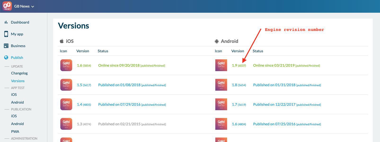 Neben der Versionsnummer in Klammern finden Sie die Revisionsnummer der Android-Engine, mit der Ihre App kompiliert wurde.