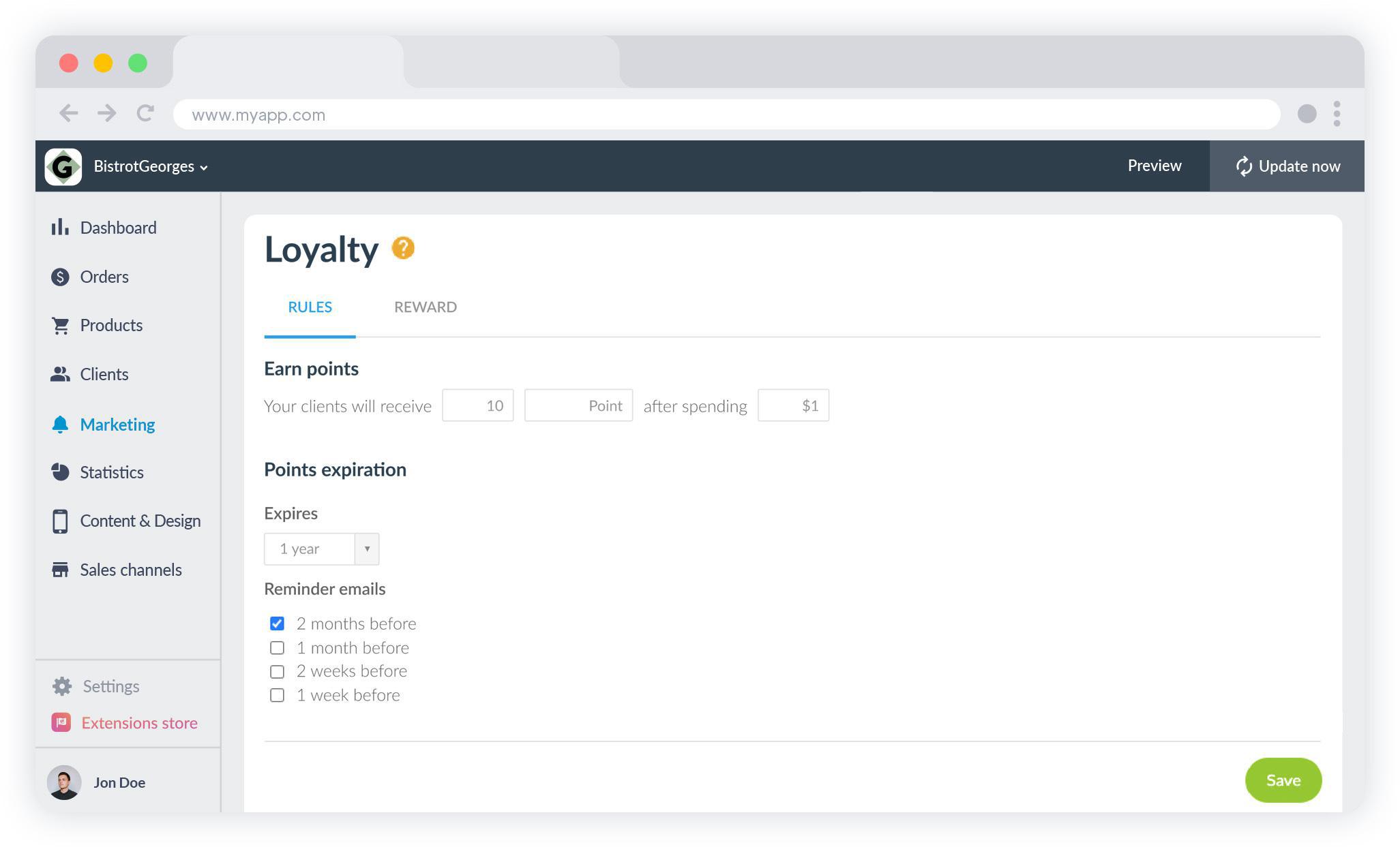 Die Einführung von Loyalty programs kann einen erheblichen Einfluss auf Ihre Online-Verkäufe haben. Indem Sie Ihren Kunden Belohnungen in Form von Treuepunkten für ihre Käufe anbieten, können Sie sie dazu bringen, immer wieder auf Ihre Website zurückzukehren und sie langfristig an sich zu binden. Natürlich liegt der Wert dieser Punkte in den Vorteilen, die sie bieten. Es ist Ihre Entscheidung, ob Sie den Kunden, die ihre Treuepunkte einlösen, einen festen Betrag auf den Gesamtbetrag des Kaufs oder eine prozentuale Rabatte anbieten.