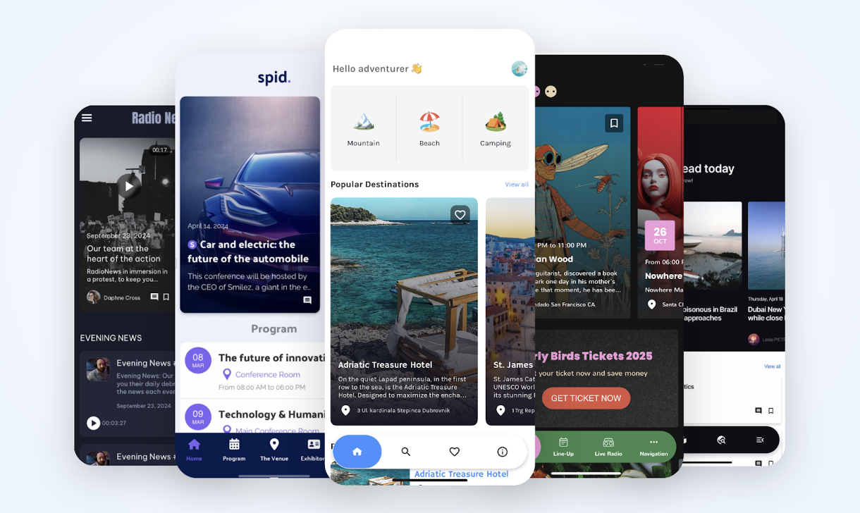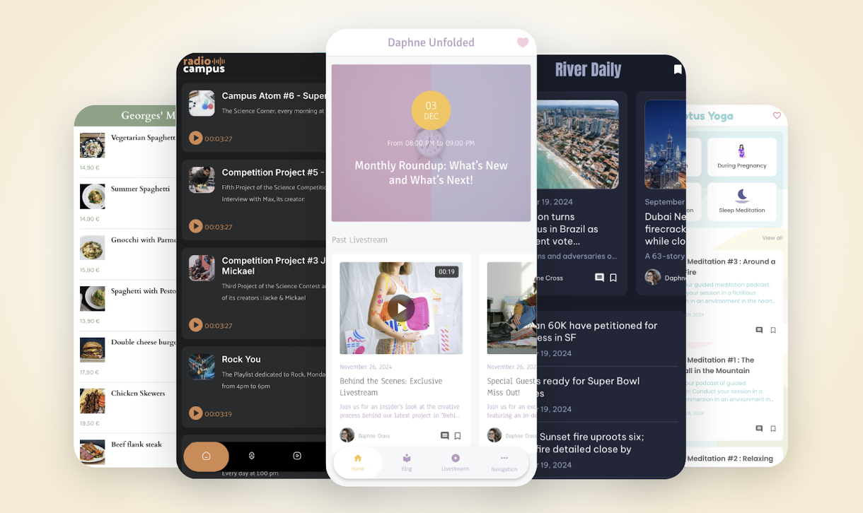 Entdecken Sie innovative Vorlagen, um Ihre Anwendungen zu transformieren: „Visual Cards“ für eine elegante Darstellung von Artikeln und Videos, „Condensed“ für kompakte, übersichtliche Produktlisten, „Visual Shortcut“ für eine flüssige, intuitive Navigation und das „Audio Widget“ für ein verbessertes Audioerlebnis mit integrierten Steuerelementen. Passen Sie sie einfach von Ihrem Backoffice aus an, um eine moderne, ansprechende Anwendung zu erstellen.