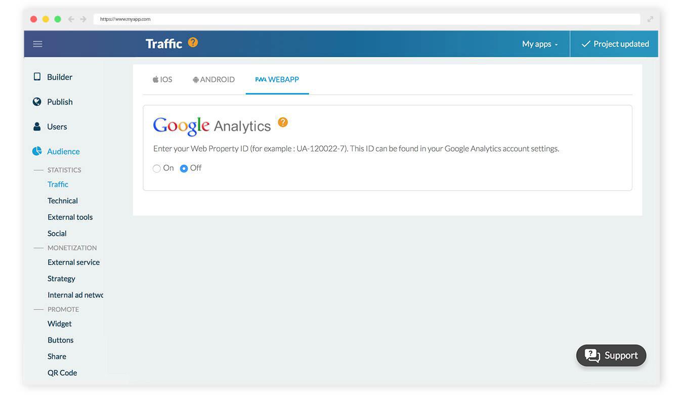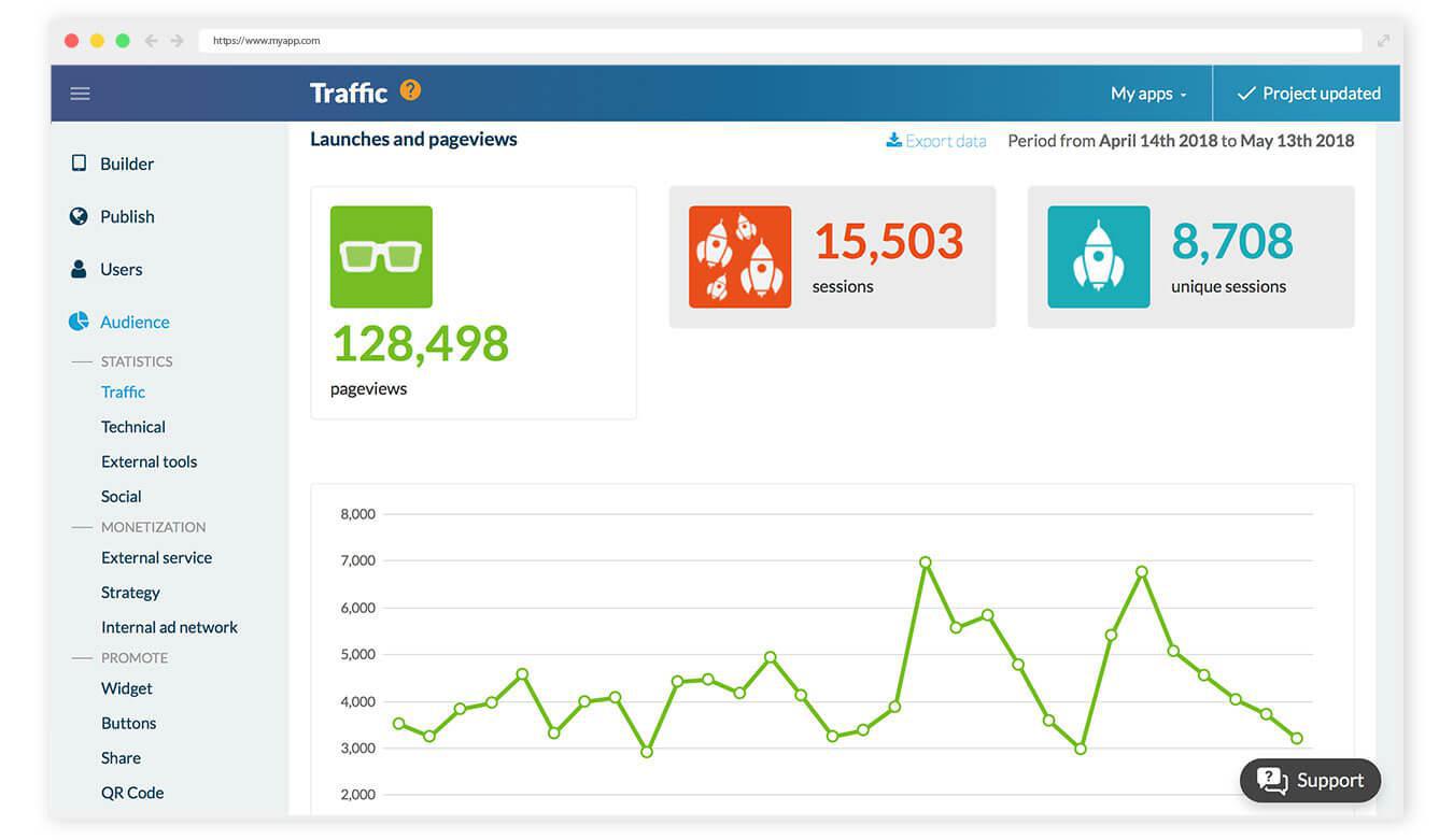 Um auf diese Statistiken zuzugreifen, veröffentlichen Sie einfach Ihre PWA und zeigen Sie sie an. Nach 24 Stunden gehen Sie zu dem Menü Audience > Statistiken > Traffic. Wenn Sie auch eine native Version Ihrer App haben, klicken Sie auf die Registerkarte Progressive Web App.