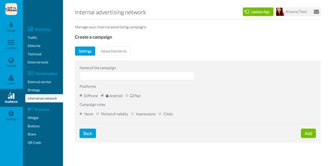 GoodBarber ermöglicht Sie Ihrer einige Werbekampagnen schaffen, wo Sie direkt Werbungsraum in der App verkaufen können. Mit die Benutzung der Daten Sie haben angesammelt, werden Sie einen sehr überzeugend Angebot für interessierten Inserente haben, denn sie können sicher sein, dass der Produkt speziell von den Vorlieben Ihrer Benutzer ist.