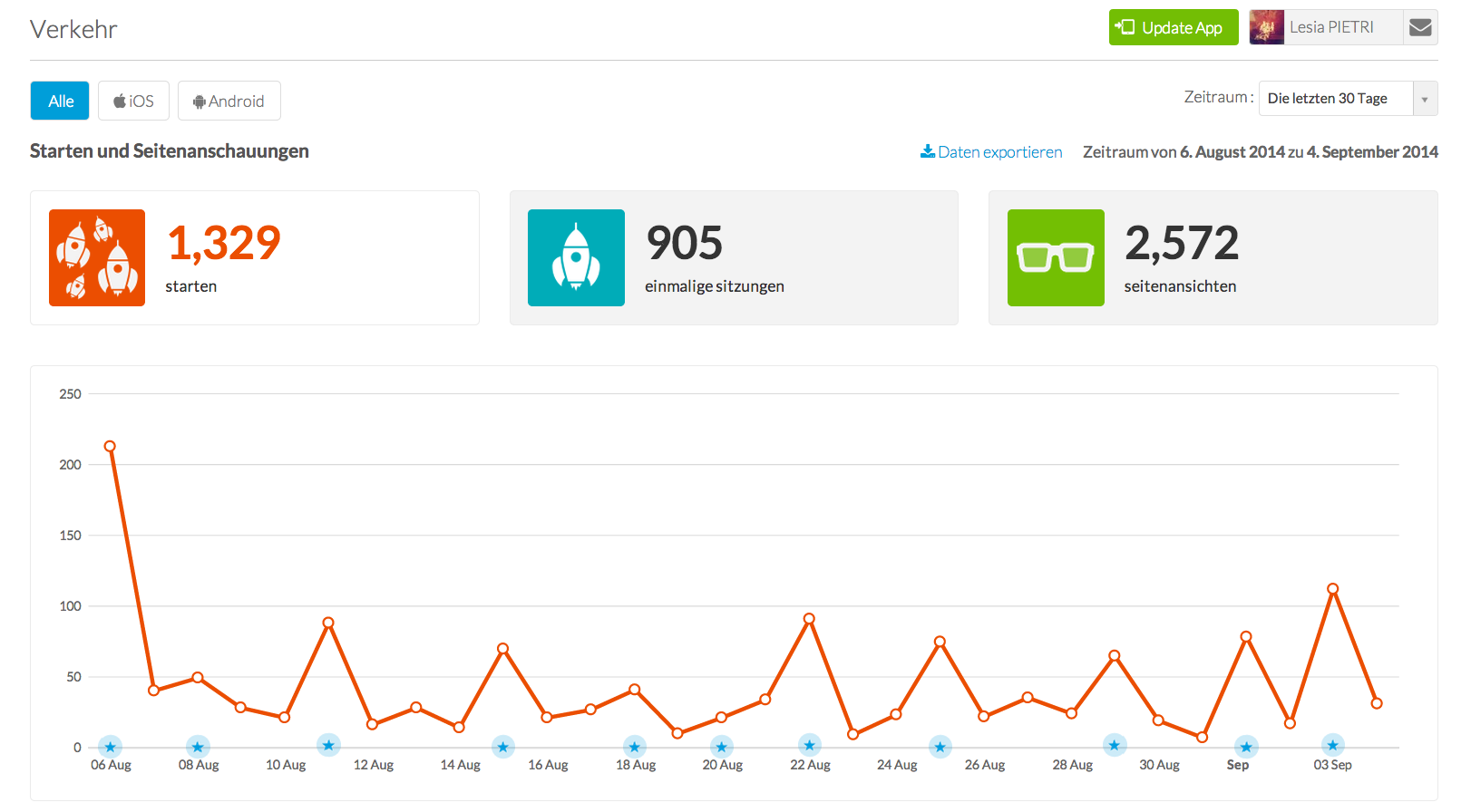 Alle diese Informationen finden Sie sobald Ihre App veröffentlicht ist direkt in Ihrem Backend. Sie können darüber hinaus auch externe Analytics-Dienste verbinde, um noch detailliertere Informationen zu erhalten.