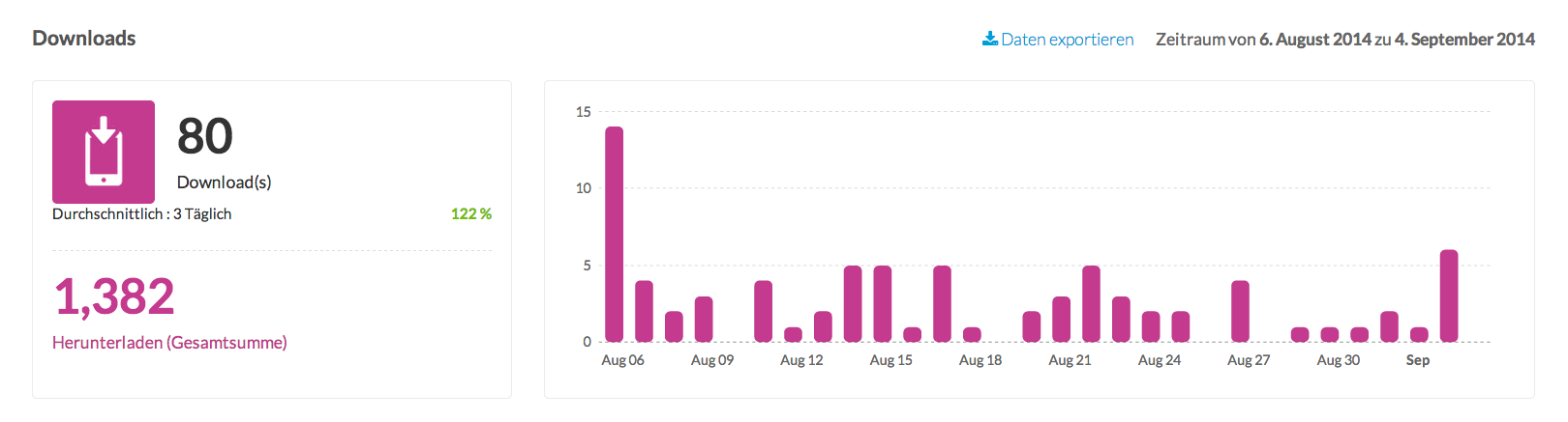 GoodBarber informiert Sie sowohl über die Gesamtzahl der Downloads als auch der Downloads pro Tag.