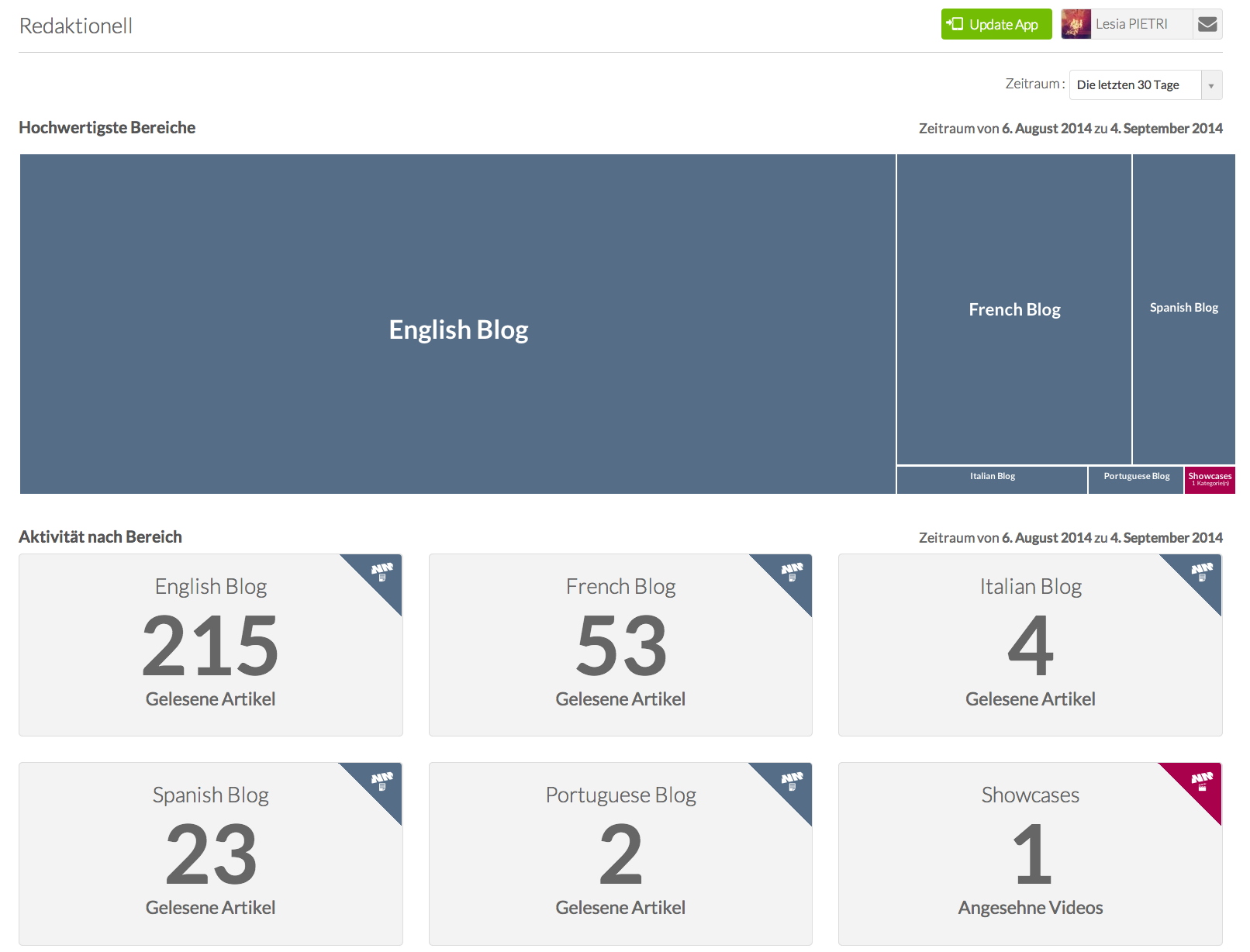 Die redaktionellen Statistiken geben Ihnen Einsichten in die Interessen Ihrer Nutzer. Sie sehen nicht nur, welche Bereiche sie vorziehen, sondern auch was sie in den Bereichen machen: Wieviele Artikel sie lesen, Wieviele Fotos sie sich ansehen, wieviele Likes sie auf Facebook erhalten, usw.