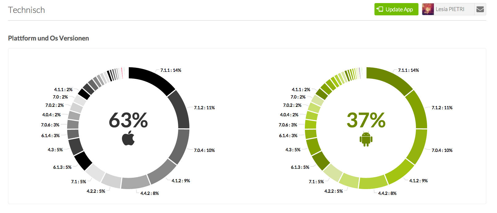 Hier sehen Sie die Segmentierung Ihrer Nutzer nach Betriebssystem (iOS oder Android), und auch nach der spezifischen iOS bzw. Android Version. Sie können sogar eine genaue Segmentierung nach Gerätetyp sehen.