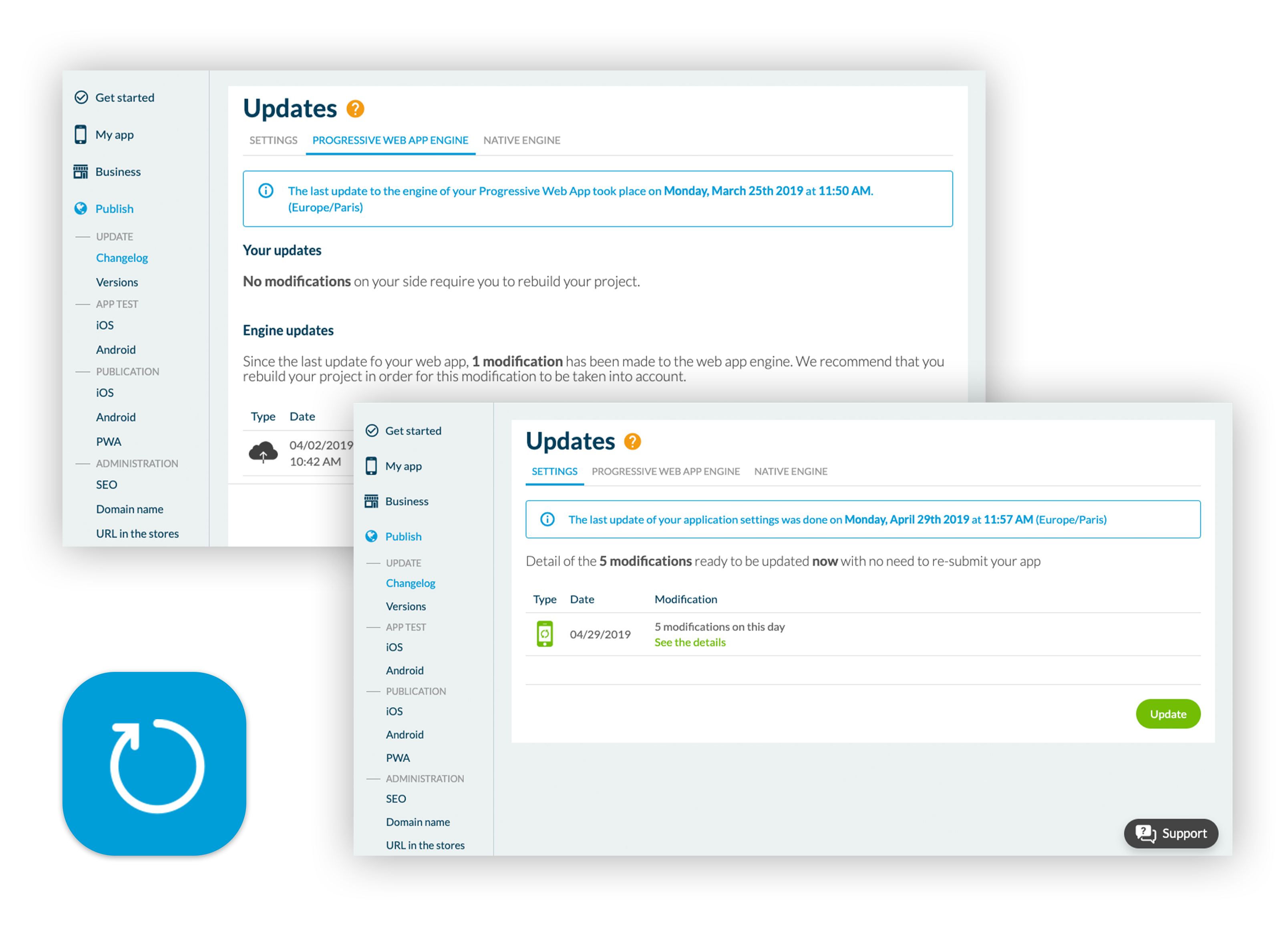 Nach dem Veröffentlichen in den Stores wird sich Ihre Anwendung weiterentwickeln. Sie werden Änderungen von Ihrem Backoffice aus vornehmen: neue Inhalte, Änderungen am Design, etc.