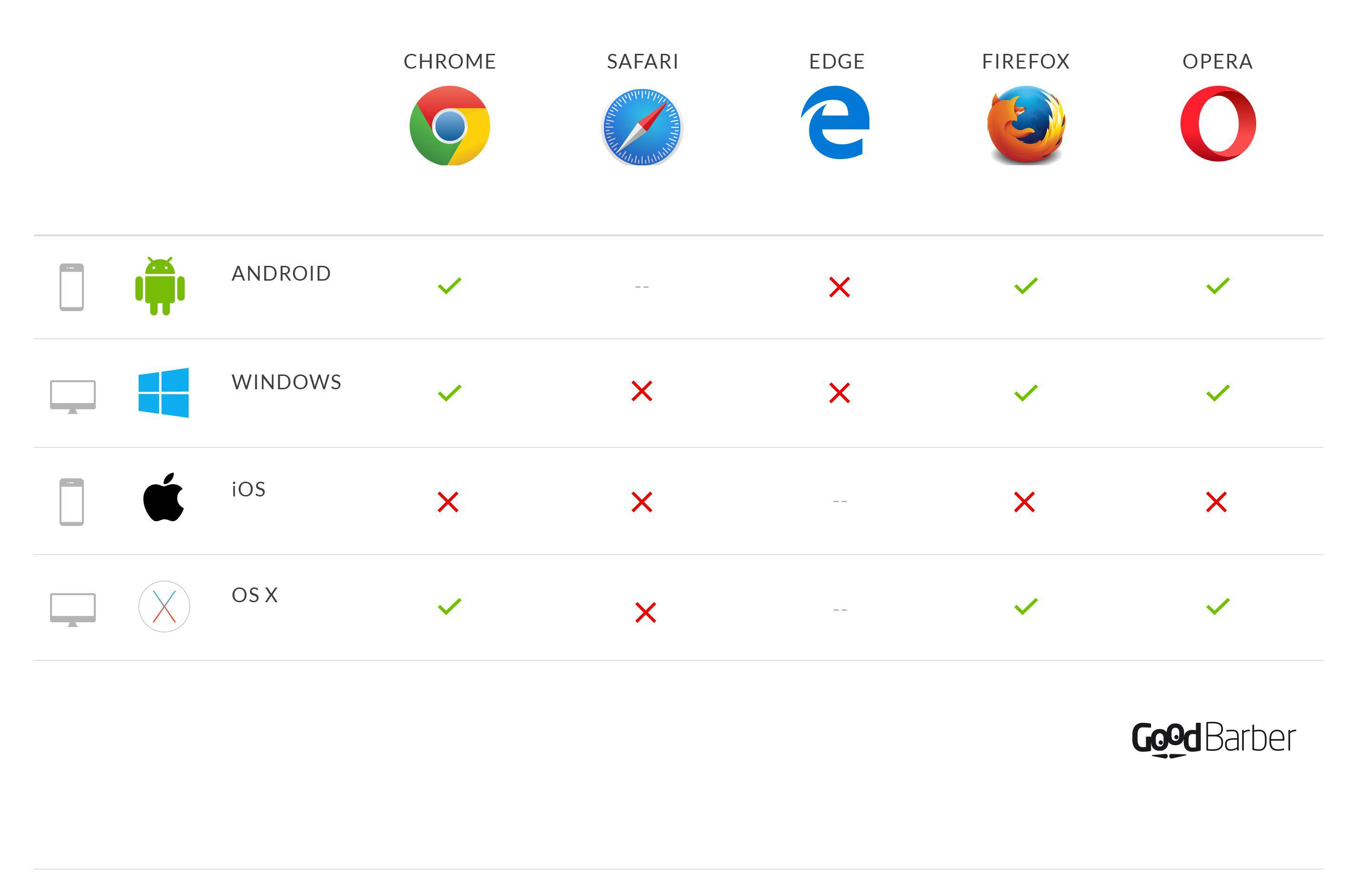 - Zweitens muss ein Browser verwendet werden, der die Verwendung von Service Workers unterstützt. Derzeit werden die Dienste von den folgenden Browsern unterstützt: Google Chrome, Mozilla Firefox, Opera, Microsoft Edge, je nach dem Betriebssystem der Maschine, auf der sie installiert sind.