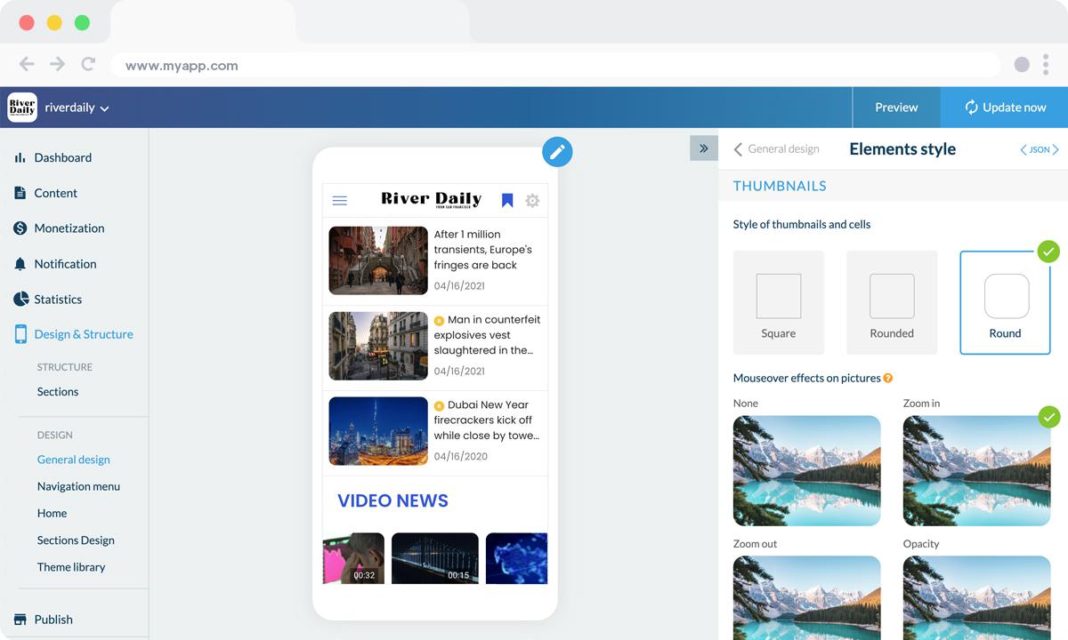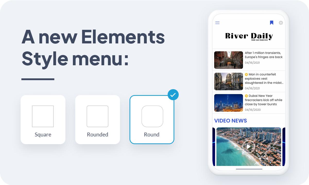 Im Backoffice Ihrer App, unter Menü Meine App > Design > Allgemeines Design > können Sie nun einen neuen Feld "Stil der Elemente "sehen.