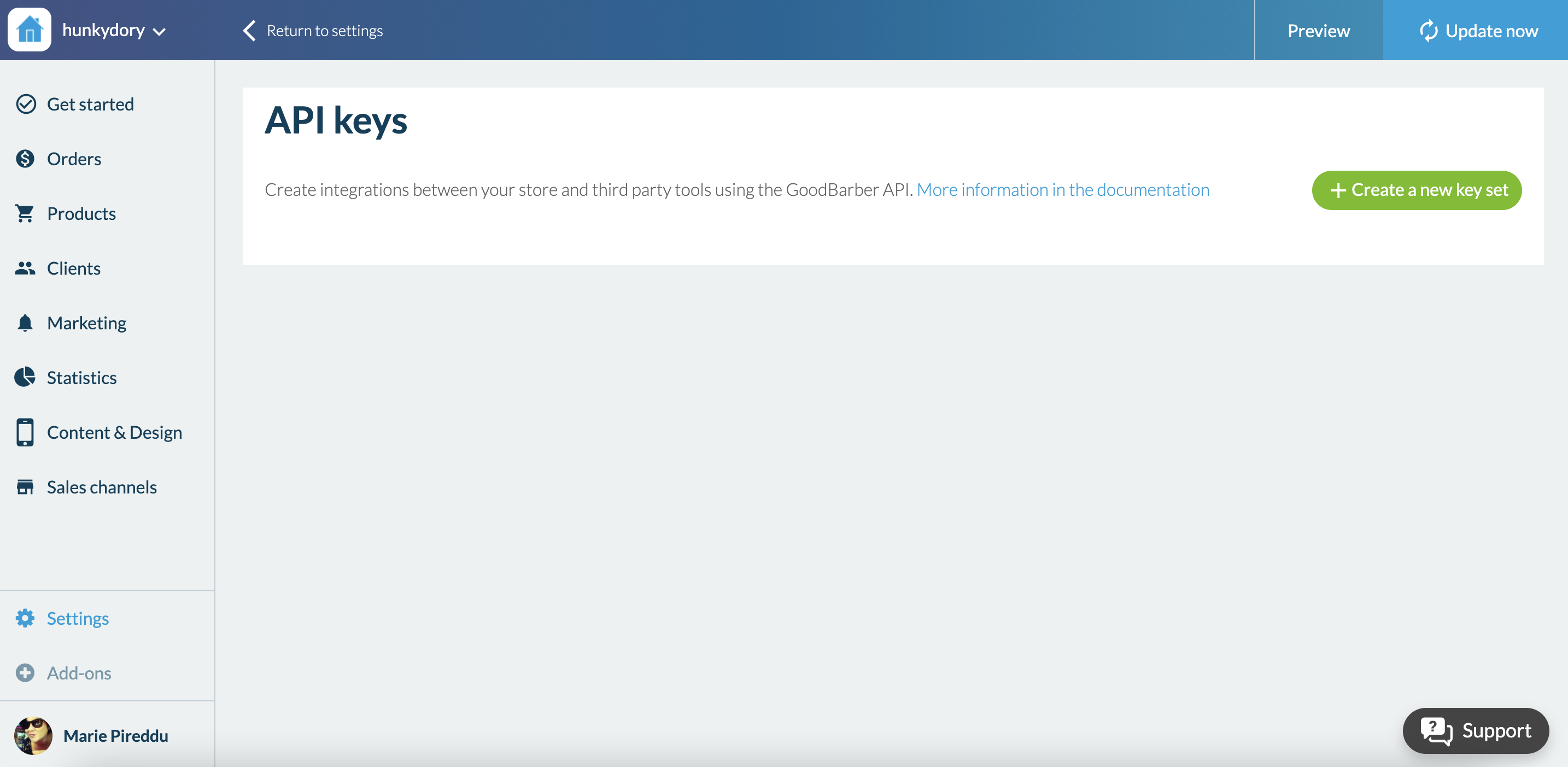 Von hier aus werden Sie Schlüsselsätze erstellen, die den Zugang zu den verschiedenen verfügbaren API-Methoden ermöglichen. Diese Sätze können unterschiedliche Zugriffsrechte haben (Katalog oder Bestellungen oder beides, nur lesen oder lesen und schreiben). Wir empfehlen Ihnen, sie so zu benennen, dass Sie sie leicht nach Ihren Bedürfnissen organisieren können.