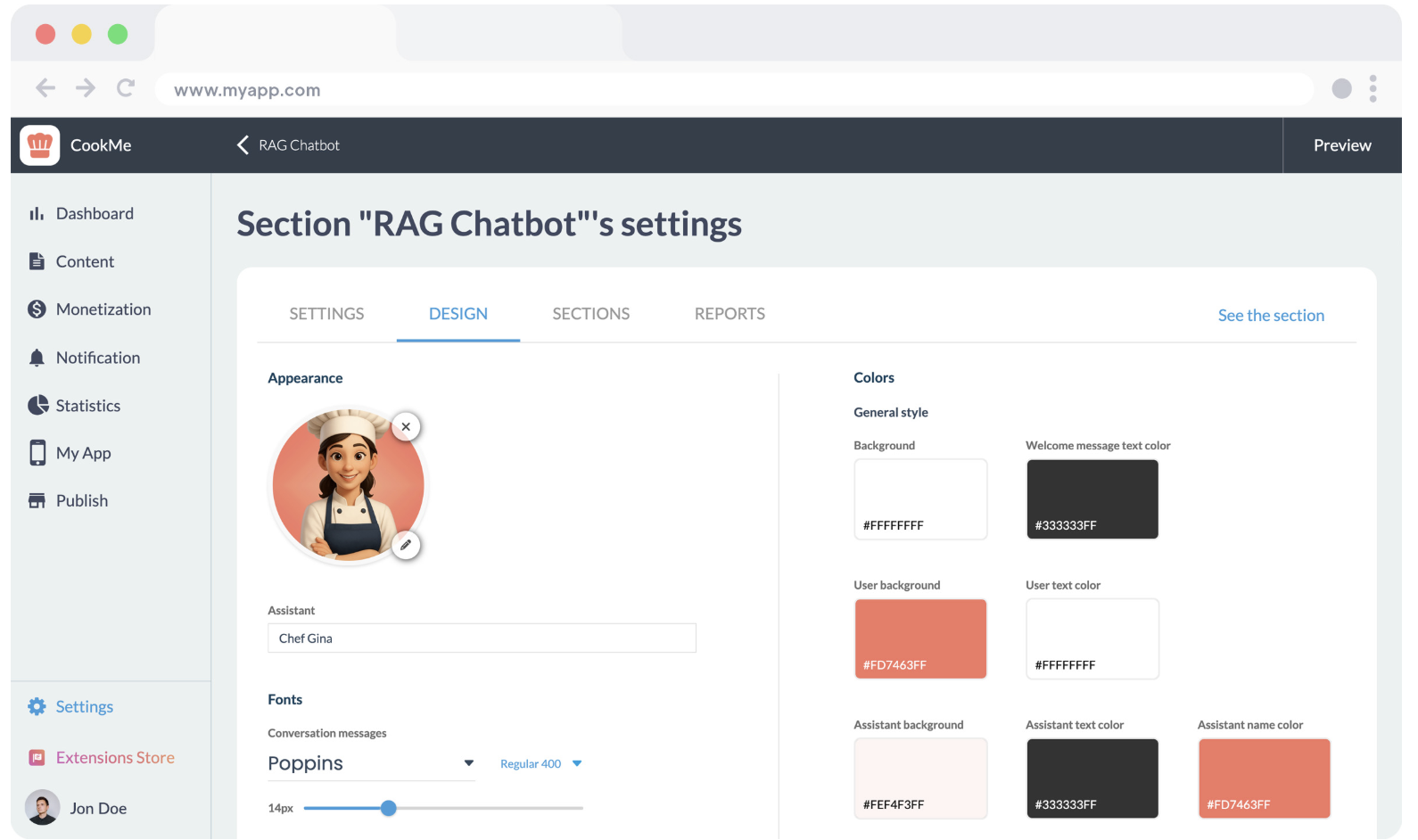 Die Einrichtung des RAG-Chatbots in Ihrer GoodBarber-App ist ganz einfach. Sie müssen lediglich die Erweiterung in Ihrem Backoffice aktivieren. Anschließend wählen Sie das gewünschte KI-Modell aus und passen das Erscheinungsbild des Chatbots an das Design Ihrer App an – Farben, Symbol und mehr.